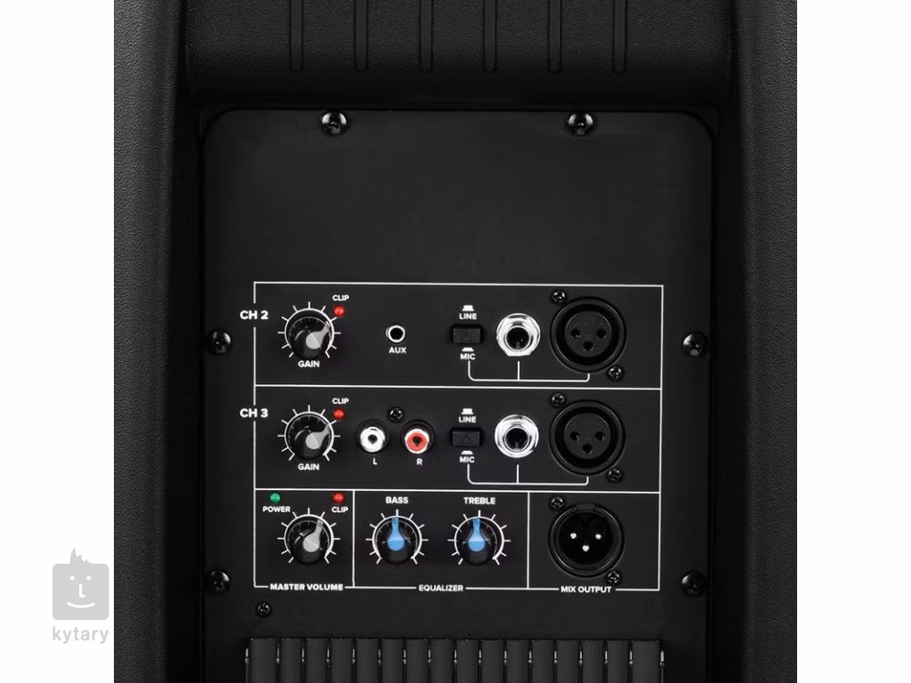 L'enceinte dispose de deux canaux, chacun permettant de connecter un instrument ou un microphone via une entrée jack ou XLR. Le canal 1 dispose également d'une prise de 3,5 mm pour l'entrée AUX, tandis que le canal 2 permet l'entrée AUX via des prises RCA. Chaque canal est équipé de sa propre commande de gain. Il y a également un réglage global du volume principal et un égaliseur à deux bandes (graves, aigus). Le panneau arrière comporte également une sortie XLR symétrique permettant de connecter l'enceinte à une table de mixage.