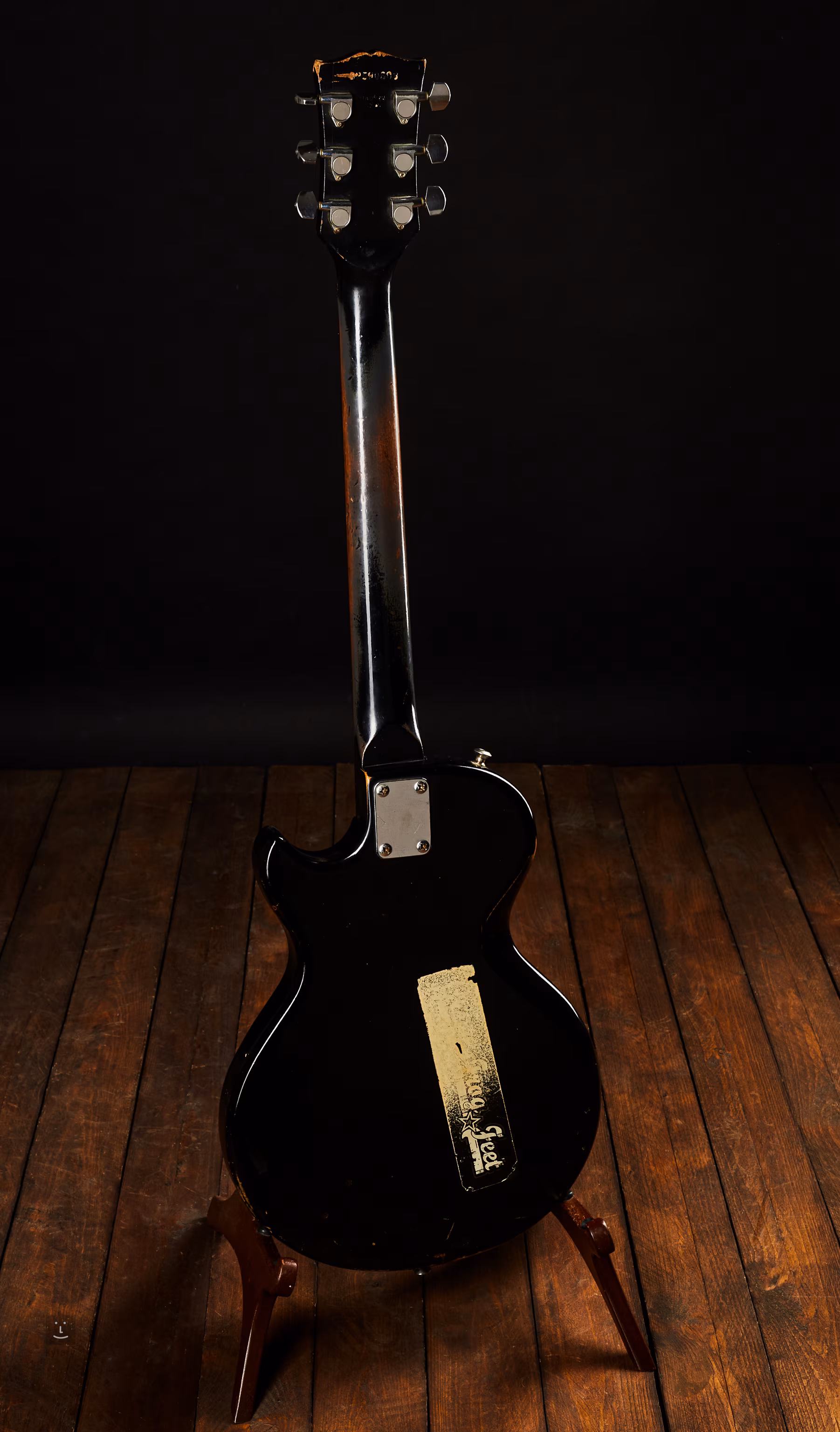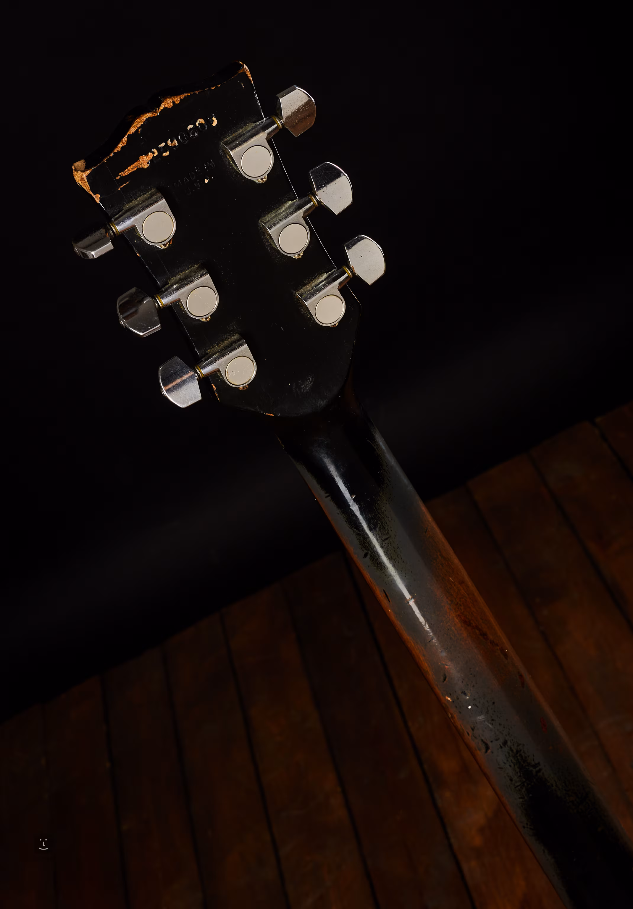 L'électronique - les potentiomètres et le commutateur sont d'origine, le micro manche est un Gibson d'origine (marqué Sonex 180 deluxe 229954), et le micro manche est un Seymour Duncan SH8B plus récent. Les boutons de potentiomètre ne sont pas non plus d'origine, la touche en palissandre a probablement été repoussée dans le passé, la frette zéro est également plus récente. Il y a de nombreuses éraflures sur les bords du corps et sur la tête, l'une d'entre elles affectant même le numéro de série, mais celui-ci est encore lisible.