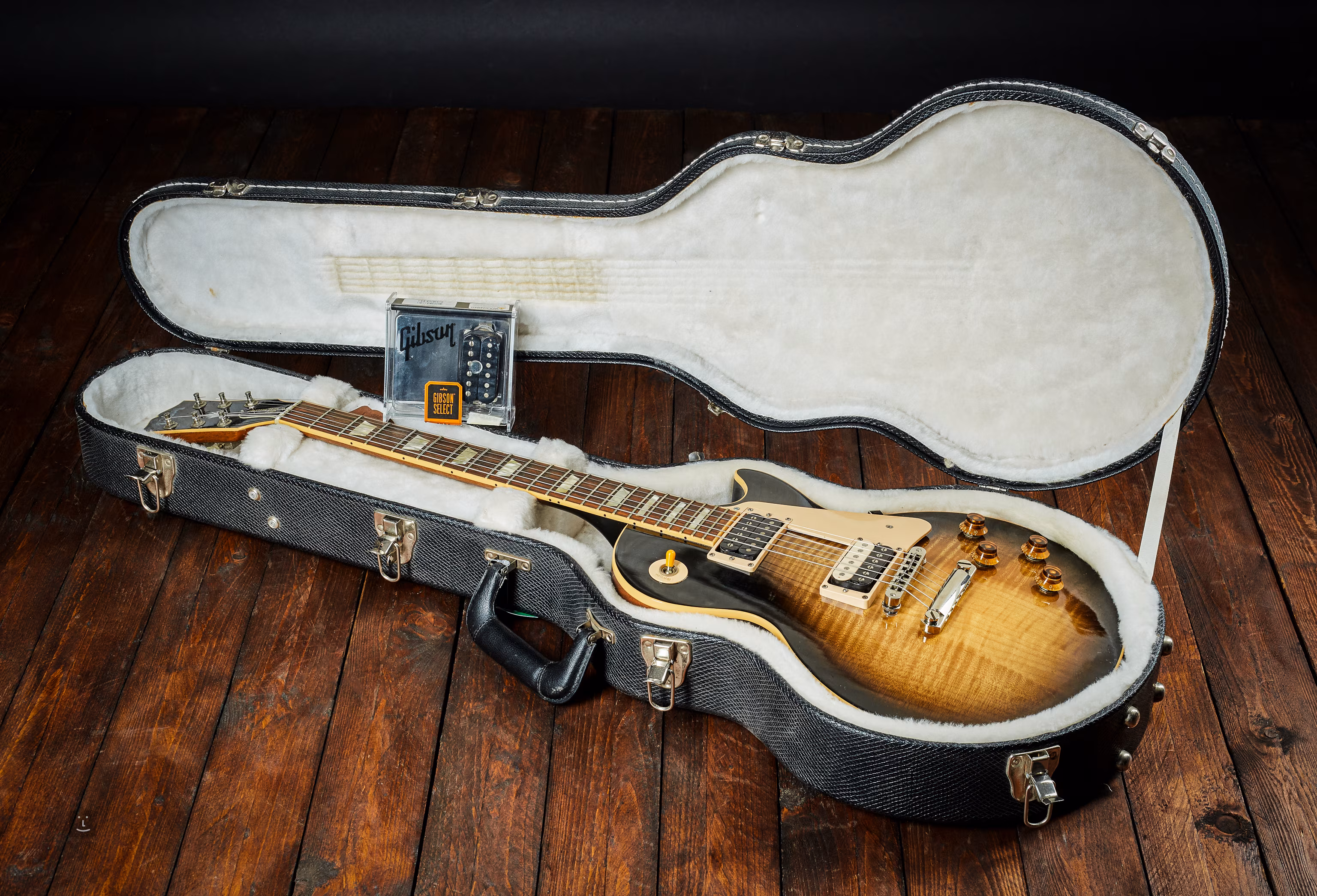 Cet instrument a été fabriqué en 2008 aux États-Unis (la production de la LP Classic Antique a été arrêtée en 2009). Un micro Gibson 498T zebra est installé en position cobbler, le Classic 57 d'origine est inclus dans l'étui.