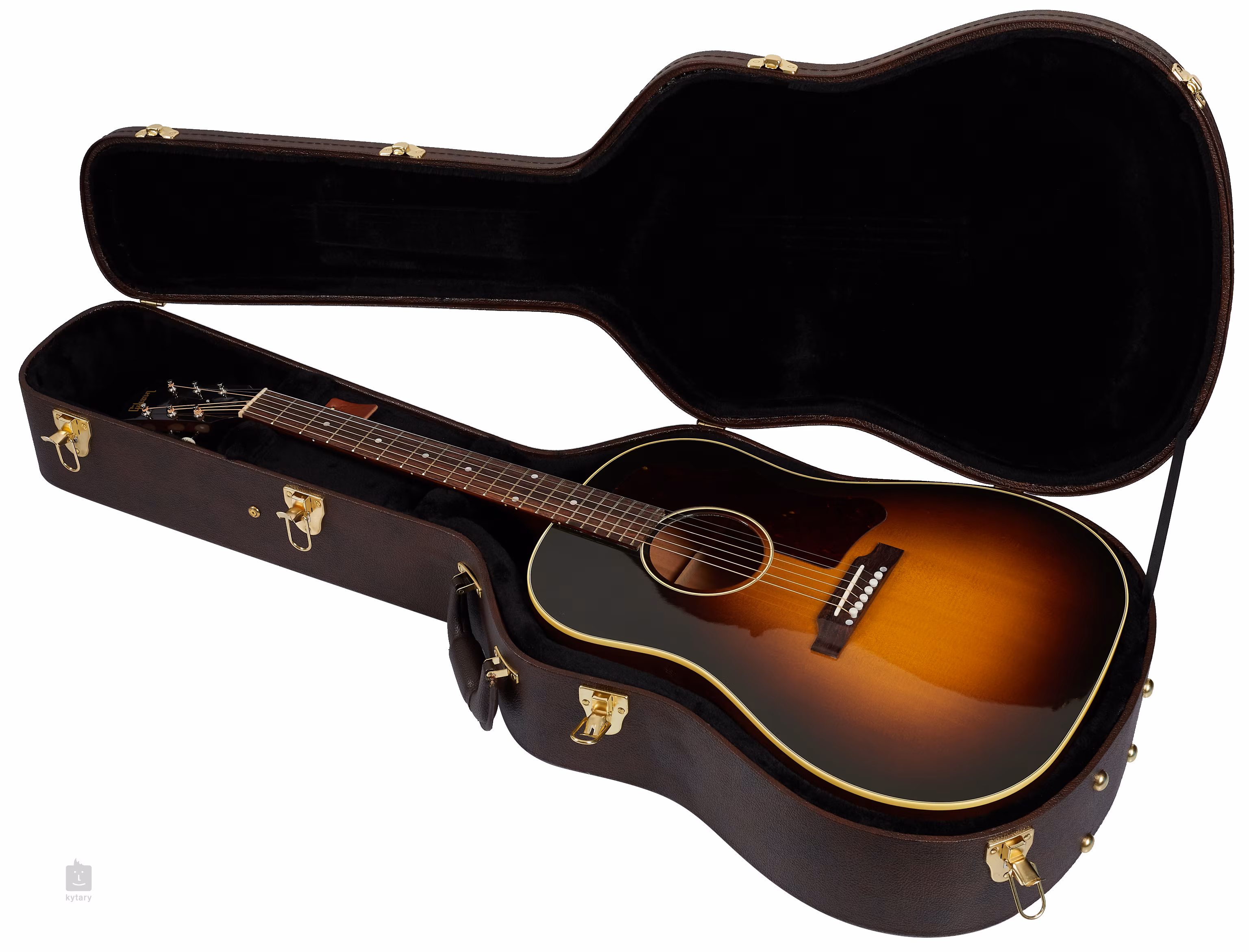 La 50s J-45 Original renvoie à l'âge d'or de Gibson, les années 1950. La table d'harmonie de la guitare est en épicéa de Sitka massif, tandis que le dos et les éclisses sont en acajou massif. La résonance de la table est soutenue par des nervures en X taillées à la main. Le manche en acajou au profil "Round" est collé à une touche en palissandre munie de vingt frettes de taille standard. L'orientation sur la surface de la touche est facilitée par des points de positionnement en nacre.