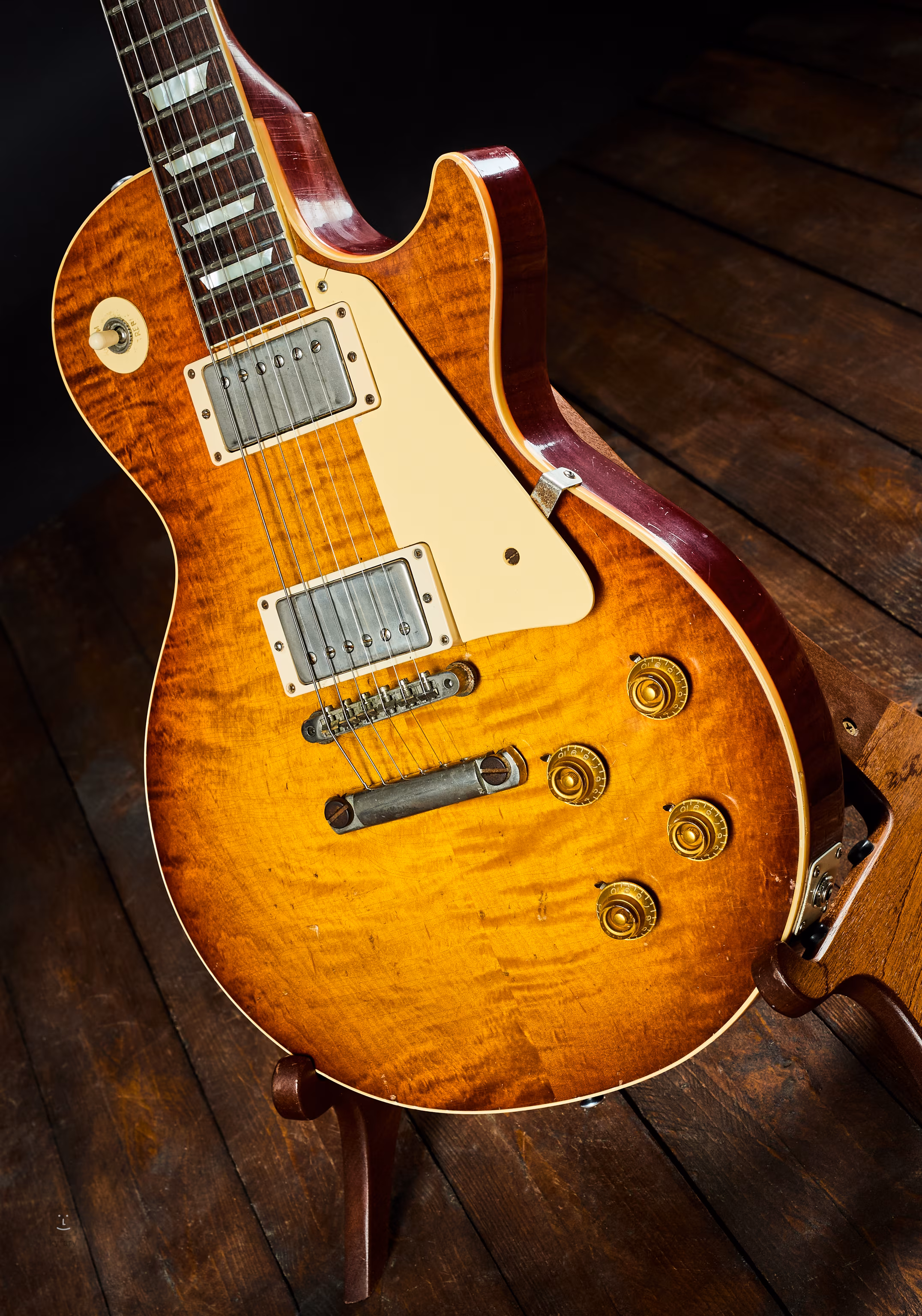 Edition Collector limitée 2017 Les Paul True Historic 1959 Tom Murphy Painted & Aged de Gibson Custom Shop. Cet instrument est une exception, non seulement en raison de sa rareté et de sa valeur originale élevée - contrairement à la plupart des instruments de cette catégorie supérieure, il n'a pas passé sa vie uniquement dans des collections. Cette guitare a été beaucoup utilisée et, à plusieurs endroits, en plus de la fausse patine réalisée par le maître constructeur Tom Murphy, il y a une patine qui a été créée en jouant réellement. Le futur propriétaire ne doit pas avoir peur de monter sur scène avec une Les Paul comme celle-ci.