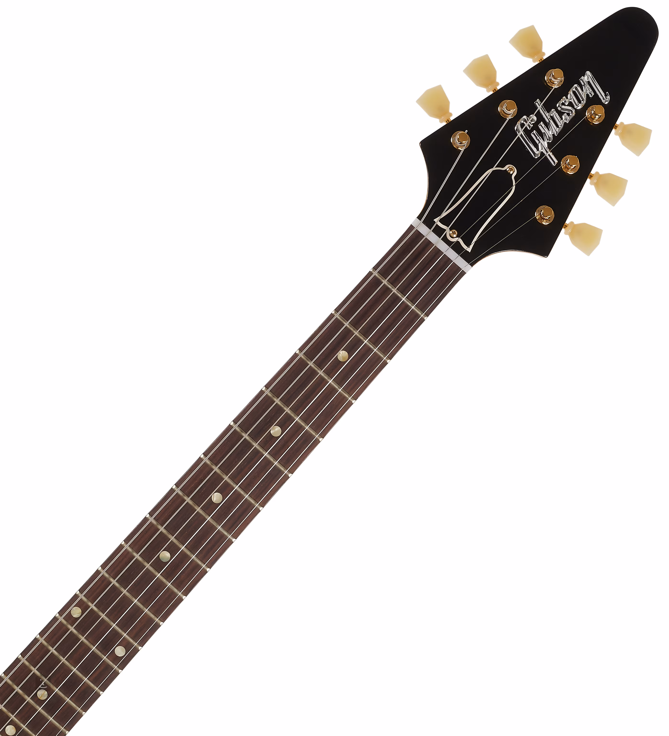 Deux micros humbuckers Custombucker confèrent à la guitare le son chaud et classique des micros PAF. Les cordes sont montées dans des mécaniques Kluson Single Line et traversent le corps par l'intermédiaire du chevalet ABR-1. La finition élégante est accentuée par un accastillage Aged Gold, un pickguard '58 Flying V noir à quatre plis et tous les autres détails d'époque.