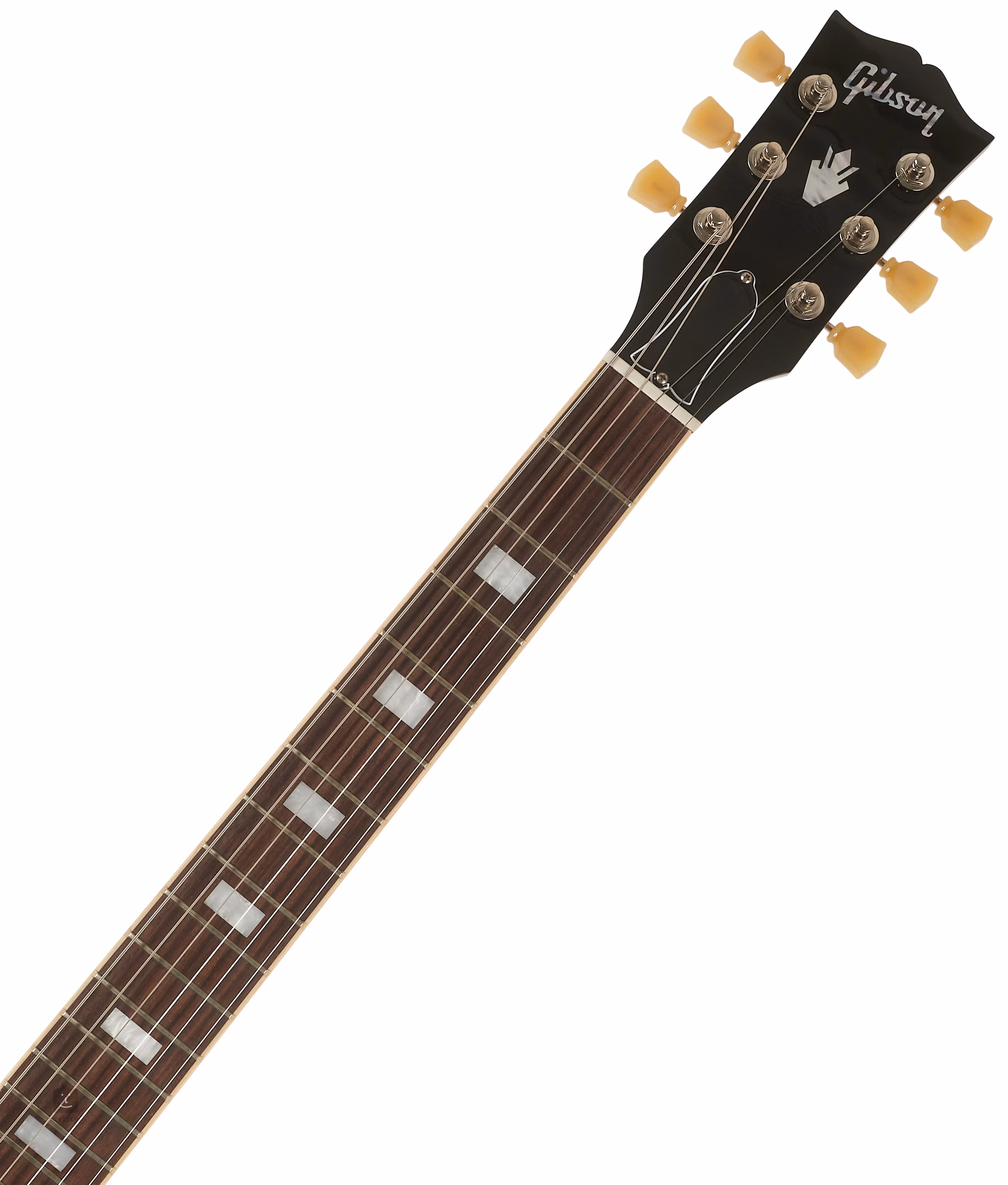 La stabilité de l'accordage et un bon sustain sont garantis par la fixation des cordes sans frette GraphTech dans le mécanisme Vintage Deluxe avec les chevilles Keystone et le chevalet ABR-1 TOM dans les cordes. L'impression de style est accentuée par le pickguard noir à cinq plis, l'accastillage en nickel, la bordure crème et le logo sur la tête de la guitare.