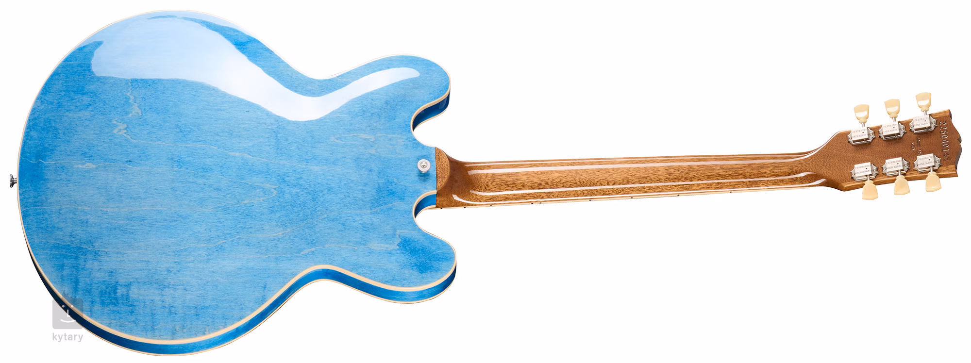 Le corps de la ES-335 Ocean Blue Custom Color Series est fabriqué en érable et en peuplier stratifiés. Le bloc central en érable augmente la solidité de la construction semi-hollow et la résistance au "binding". Les qualités sonores de l'instrument et son grand sustain sont renforcés par des nervures en épicéa d'Adirondack et une fine couche de laque nitrocellulosique qui permet au bois de respirer.