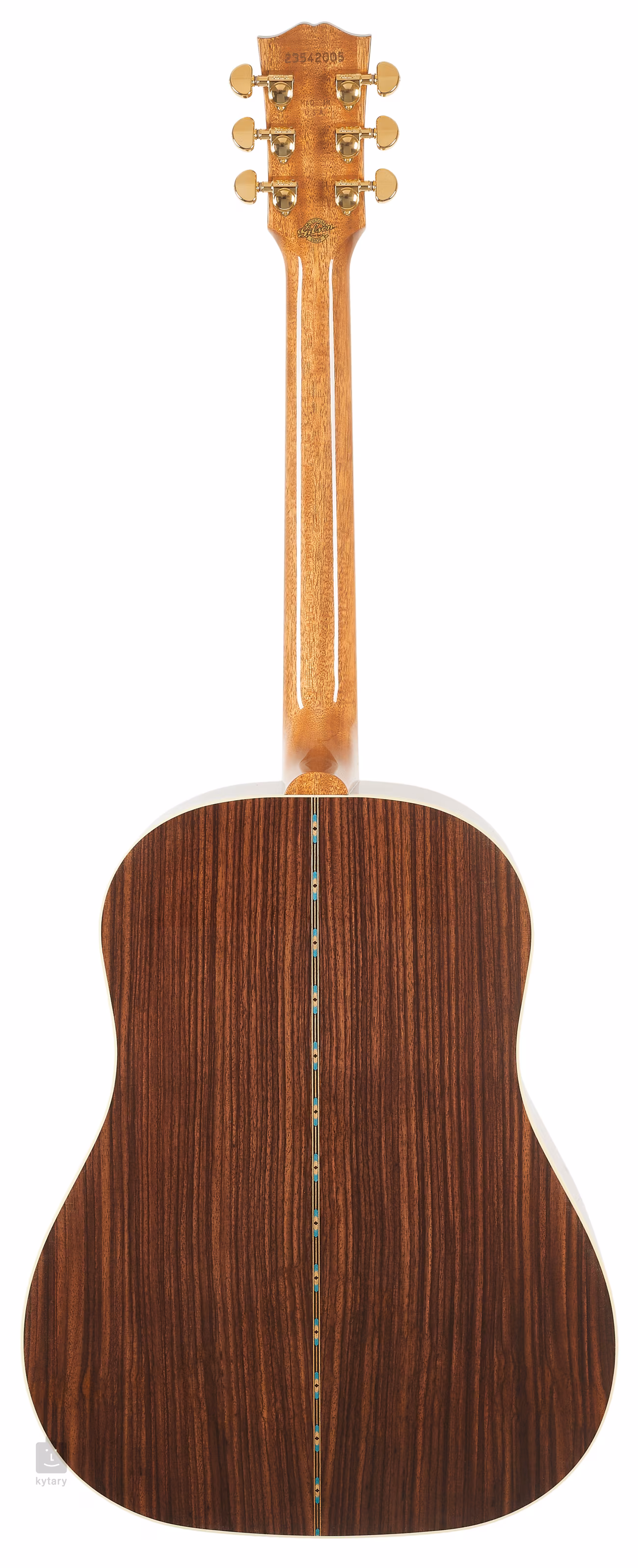 Les cordes sont fixées par une touche en os et un sillet de chevalet dans des mécaniques Grover Rotomatics et une touche en ébène. La finition luxueuse est accentuée par la garniture décorative de la table, la bande centrale sur la plaque arrière, le pickguard "Tear Drop" bordé d'or et l'accastillage doré.