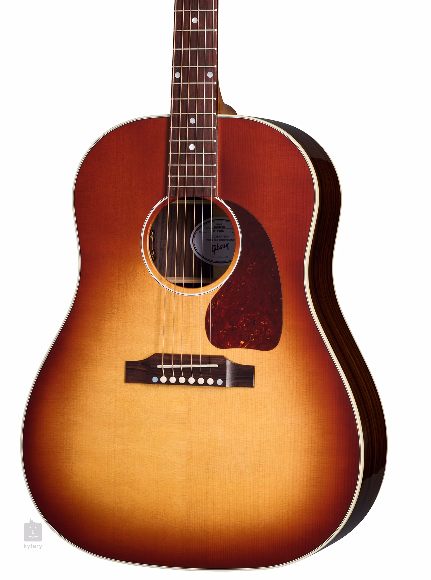 La table d'harmonie de la guitare électroacoustique J-45 Standard Rosewood Rosewood Burst est en épicéa de Sitka, tandis que le fond et les éclisses sont en palissandre. La résonance de la table est soutenue par des nervures en X taillées à la main, et le corps est recouvert d'une laque nitrocellulosique brillante. Le manche en acajou est surmonté d'une touche en palissandre indien munie de vingt frettes de taille standard. L'orientation sur la touche est facilitée par des points de positionnement perlés.