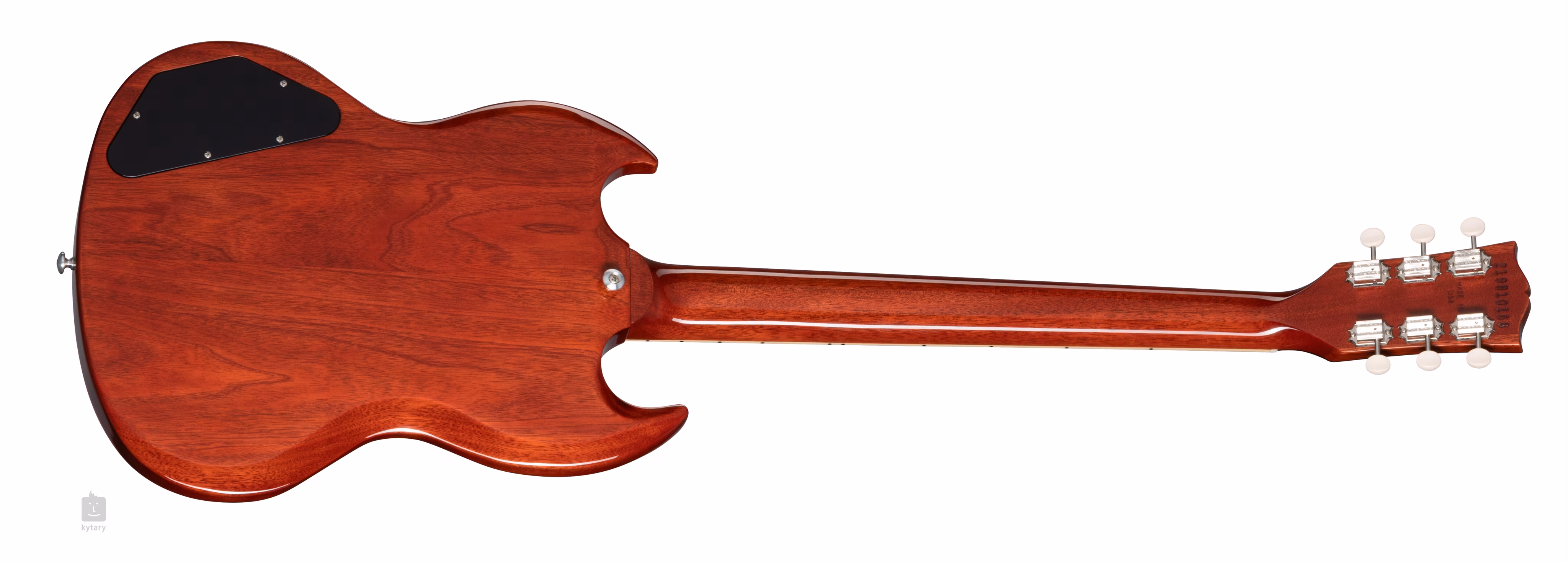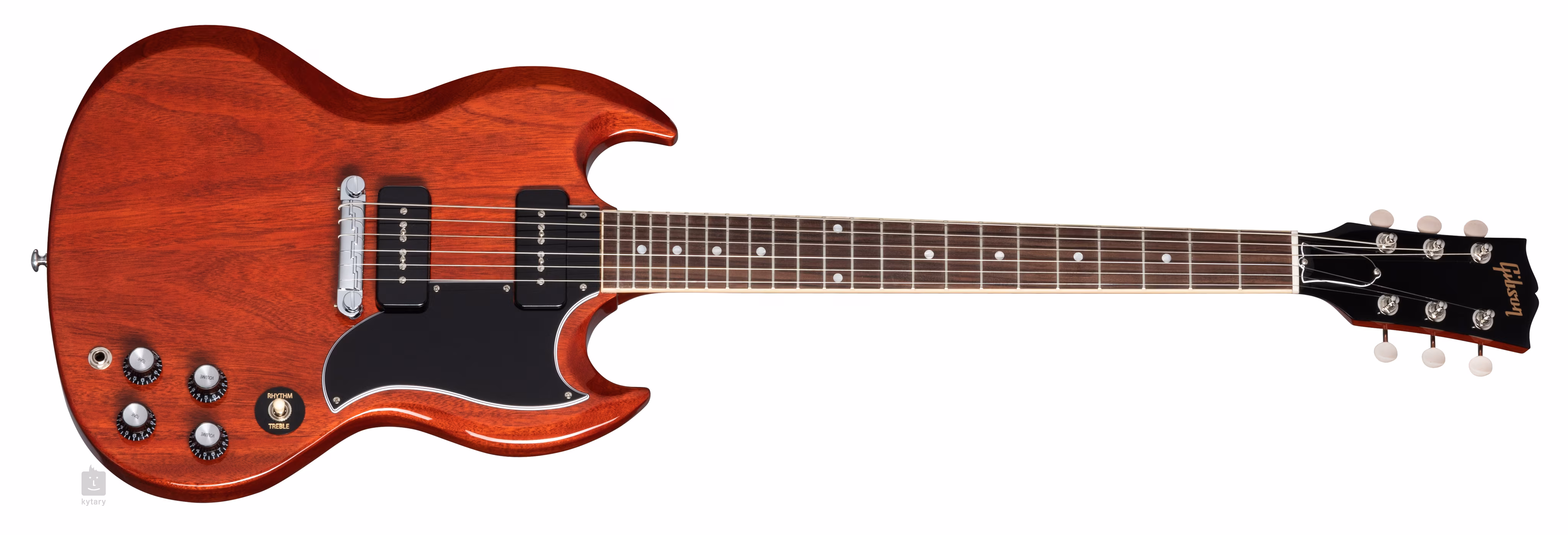 La SG Special Vintage Cherry reprend le design classique de la SG du début des années 1960. Le corps en acajou de la guitare est recouvert d'une fine couche de laque nitrocellulosique, qui laisse le bois respirer et améliore les qualités sonores de l'instrument. Un manche en acajou au profil confortable Slim Taper est collé à une touche en palissandre dotée de vingt-deux frettes Medium Jumbo. L'orientation de la touche est facilitée par des points de positionnement en imitation nacre.