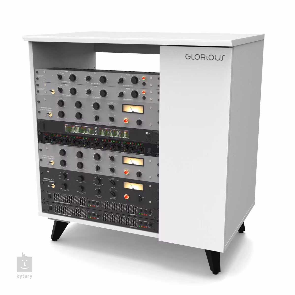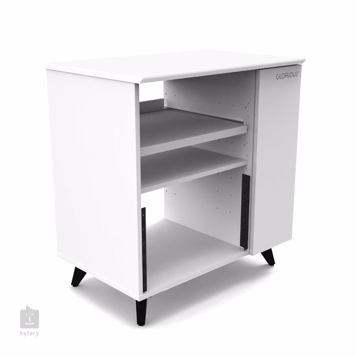 Il n'y a pas deux studios d'enregistrement identiques, c'est pourquoi le Glorious Modular Side Rack a été conçu avec un maximum de flexibilité à l'esprit. Ce meuble de studio élégant est un rack variable divisé en deux sections principales qui complètent parfaitement les gammes Soud Desk et Wokbench. La plus grande section (à gauche) consiste en un espace de rack (jusqu'à 12U) qui peut être utilisé en partie pour installer deux étagères, dont l'une est équipée d'un mécanisme d'extraction pratique. Les deux parties peuvent être réglées en hauteur, mais il est également possible de n'en choisir qu'une seule (ou aucune), ce qui permet de donner la priorité à l'espace réservé aux unités de rayonnage. La façon dont vous concevez l'agencement détermine directement les possibilités de disposition de votre matériel, l'étagère fixe étant utilisée pour le matériel auquel vous n'avez pas besoin d'accéder en permanence, tandis que le plateau coulissant peut être utilisé pour les contrôleurs, les boîtes à rythmes, les claviers ou même une platine vinyle. Le côté droit de la commode est un compartiment plus étroit, fermé par une porte, destiné au rangement des disques 33 tours ou à l'installation d'un ordinateur. Une petite étagère sert à ranger les accessoires (par exemple, les écouteurs). Le plateau supérieur est alors disponible pour d'autres besoins.