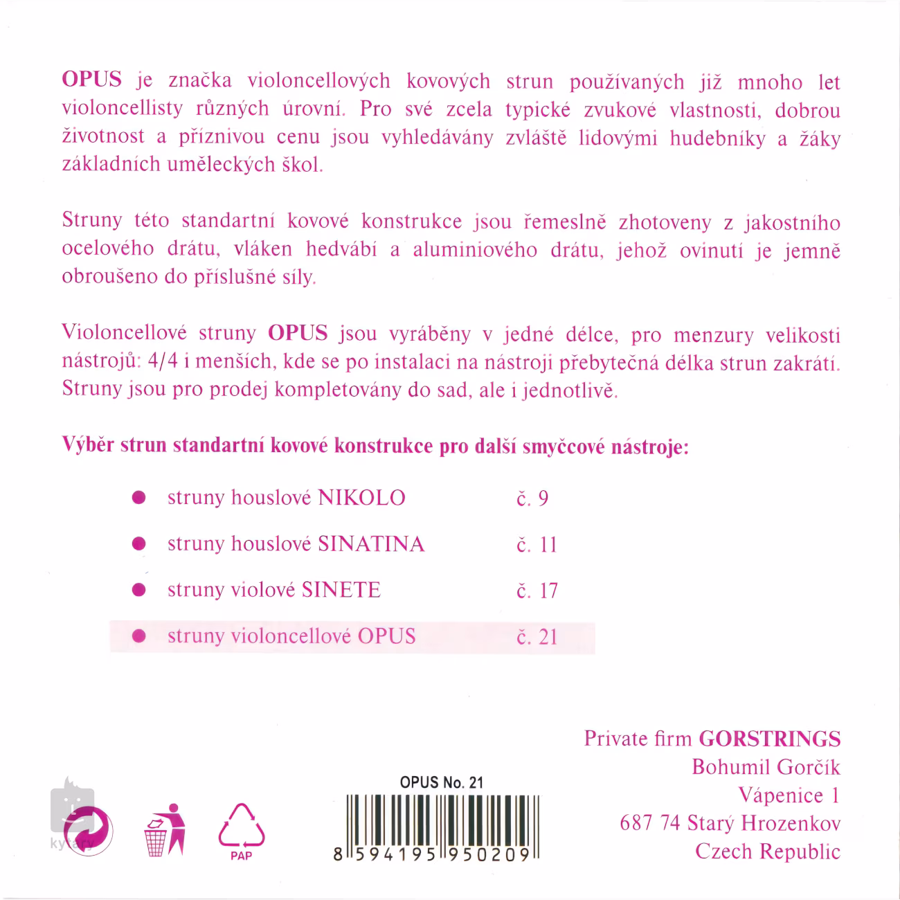 Les cordes de violoncelle OPUS sont fabriquées en une seule longueur pour les instruments de taille 4/4 et plus petits, où la longueur de corde excédentaire est raccourcie après l'installation.