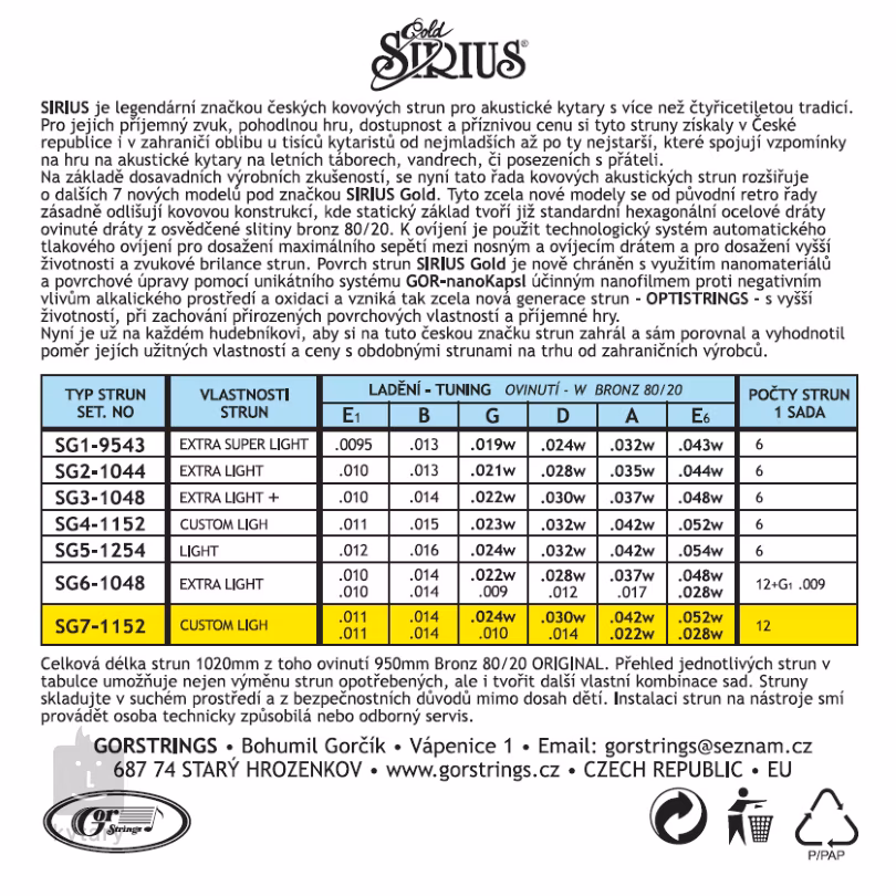 Les cordes SIRIUS ont une longue tradition sur le marché tchèque et sont très populaires, en particulier parmi les vagabonds et les joueurs de folklore. Leur grand attrait n'est pas seulement leur prix raisonnable, mais aussi leur son agréable et leur confort de jeu. Cependant, cette nouvelle série Sirius Gold diffère de la Sirius originale à plusieurs égards. Les cordes ont une âme hexagonale enroulée avec l'alliage de bronze populaire (80/20), ce qui leur confère une sonorité brillante et sonnante qui se fera remarquer lors d'un feu de camp. De plus, elles sont recouvertes d'un revêtement anticorrosion spécial qui prolonge considérablement leur durée de vie. Le résultat est une toute nouvelle génération d'Optistrings qui se distingue par un son chaud et brillant, une grande durabilité et une durée de vie extrêmement longue.