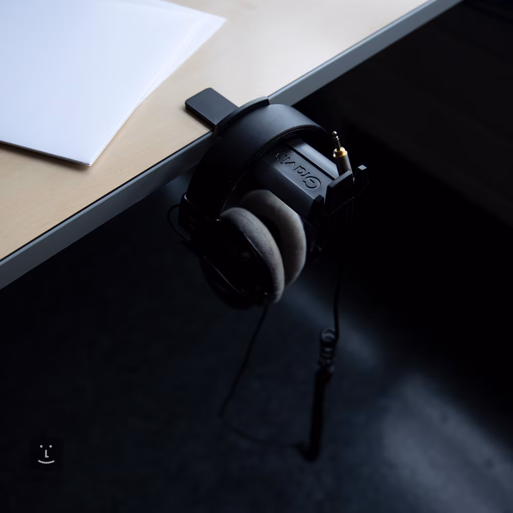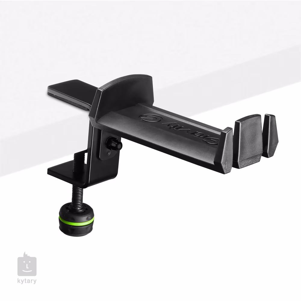 Porte-casque de studio avec vis filetée convenant aux studios d'enregistrement ou de radiodiffusion domestiques et professionnels. Le support se fixe a un plateau de table de 5 a 45 mm de diametre et comprend également des rainures spéciales pour les écouteurs In-Ear et une gestion parfaite des câbles.