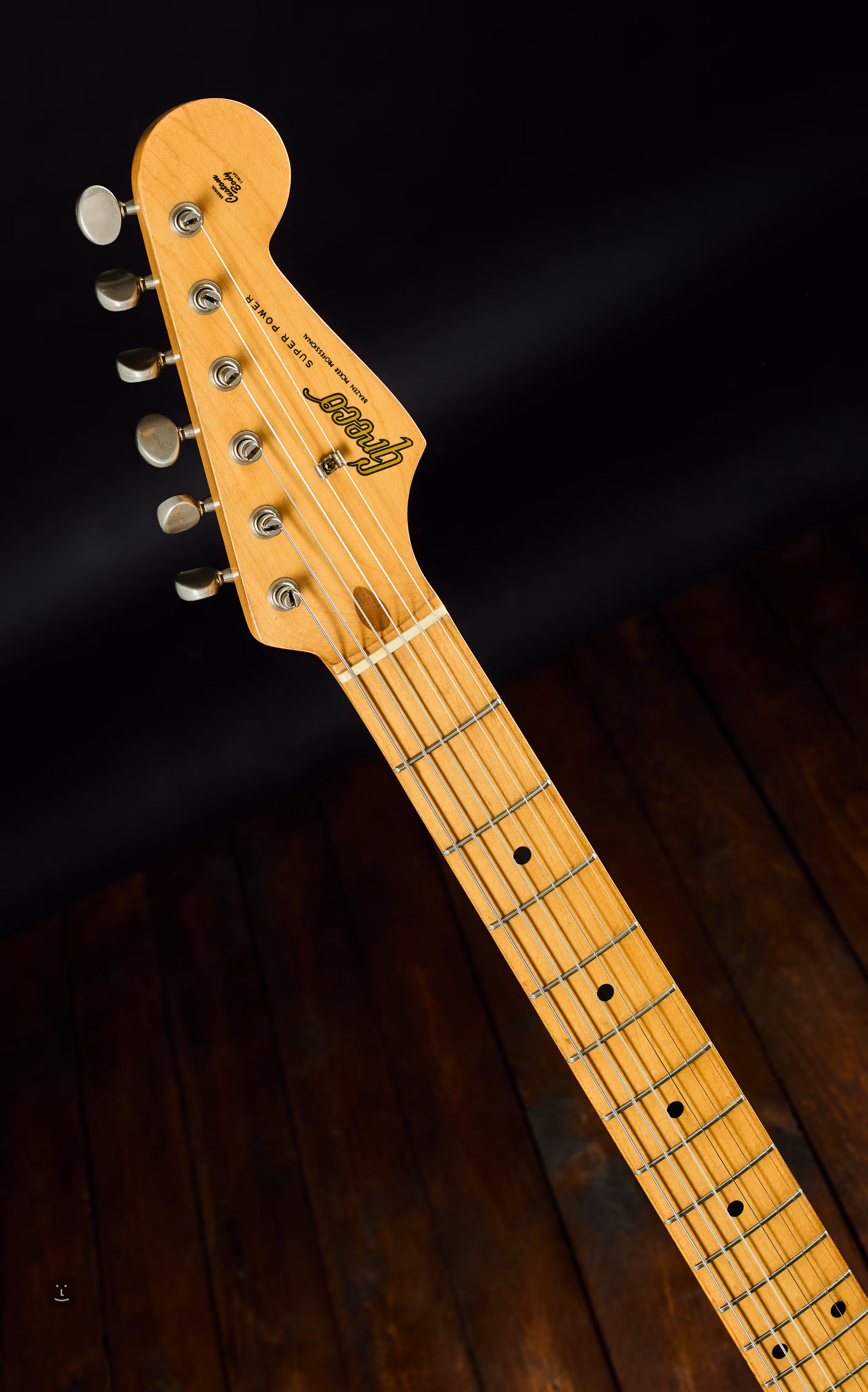 Super Power est une copie d'une stratocaster des années 60 fabriquée au Japon en avril 1981. À cette époque, les Japonais avaient maîtrisé les techniques de fabrication à la perfection et, pendant la courte période du début des années 80 avant que la justice ne les atteigne, ils ont produit un certain nombre d'excellents clones des modèles américains. Ces modèles dits "de procès" sont aujourd'hui appréciés pour leur excellente sonorité, leurs bois honnêtes et leur ressemblance détaillée avec l'original.