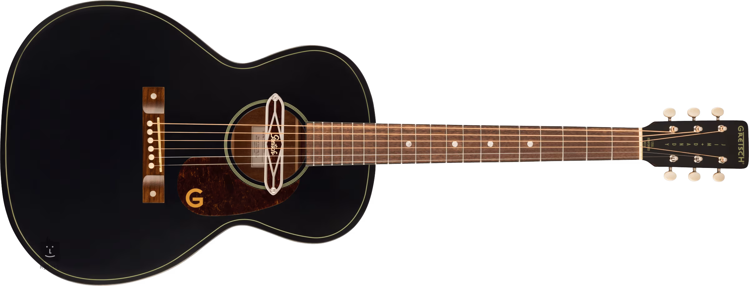 Un micro magnétique Gretsch Deltoluxe placé dans la table d'harmonie offre la possibilité de renforcer le son. Les cordes sont fixées par un sillet en os synthétique compensé et à frette zéro dans une mécanique ouverte moulée sous pression et une touche en noyer. Le look élégant de la guitare est accentué par la finition Black Top de la table d'harmonie, le pickguard simple épaisseur, les bordures imitation écaille de tortue et les accessoires en nickel.