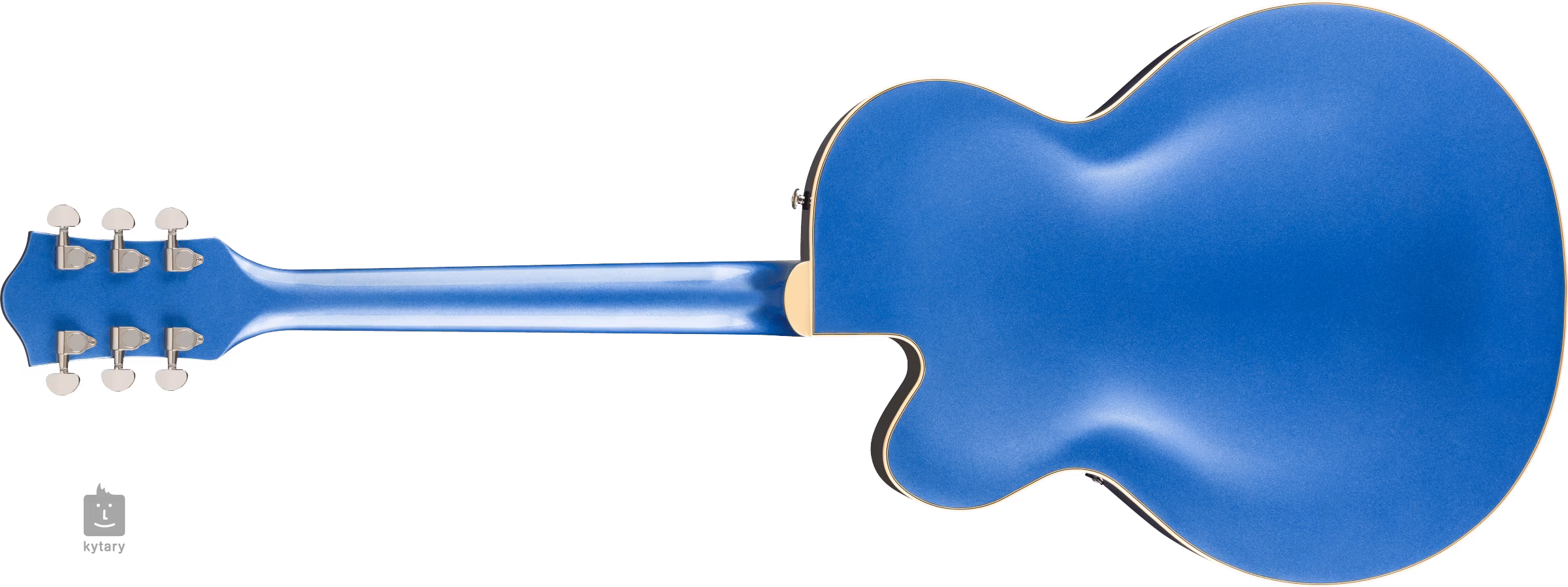 Le corps de la G2420T Streamliner Hollow Body Single-Cut Fairlane Blue est en érable laminé. Le manche en nato avec un profil "Soft C" est collé à une touche en figue avec vingt-deux frettes Medium Jumbo. L'orientation sur sa surface est facilitée par des repères de position décalés en imitation nacre (Pearloid Neo-Classic Thumbnail).