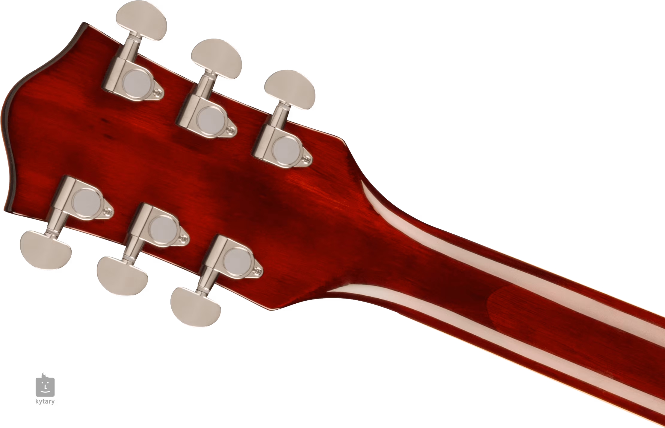 Les cordes sont ancrées par une frette zéro en os dans les mécaniques moulées sous pression de l'entreprise et par un cordier Adjusto-Matic dans un trémolo Bigsby B70 sous licence. Le design classique et agréable à l'œil des guitares Gretsch est accentué par un certain nombre de caractéristiques stylistiques - de la construction du corps arqué avec des trous en F, à la reliure élégante avec un soupçon subtil de patine (Aged White), aux potentiomètres de style "radio", à l'accastillage en nickel jusqu'au pickguard à trois couches en imitation d'écaille de tortue avec le logo Gretsch doré.