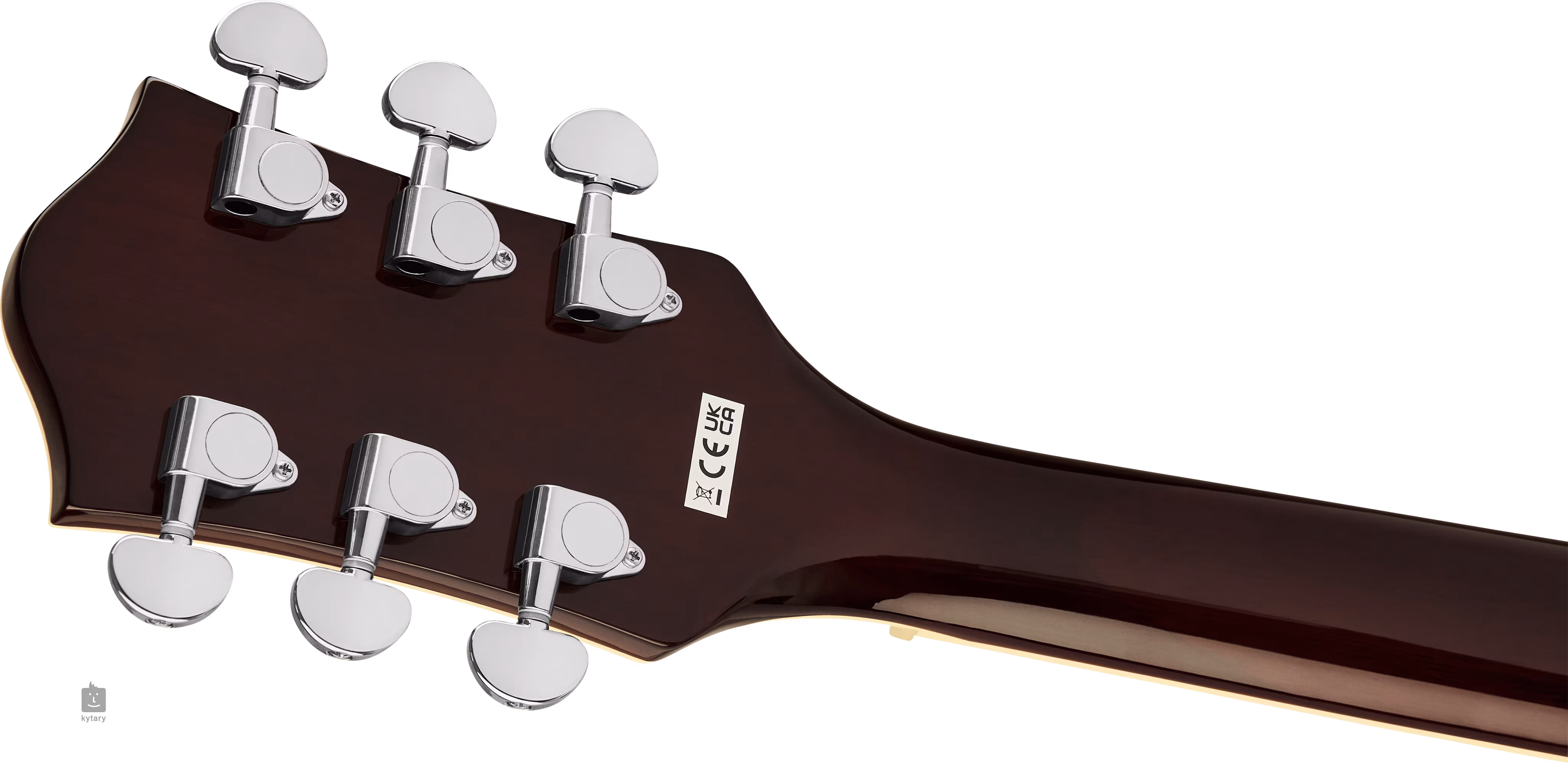Les cordes sont ancrées par une frette en os dans les mécaniques moulées sous pression de l'entreprise et par un cordier Adjusto-Matic dans un cordier V-Stoptail. Le design classique et agréable à l'œil des guitares Gretsch est accentué par un certain nombre de caractéristiques élégantes - de la construction du corps arqué avec des trous F, de la reliure élégante avec un soupçon subtil de patine (Aged White), de l'accastillage en nickel jusqu'au pickguard simple couche avec le logo Gretsch doré.