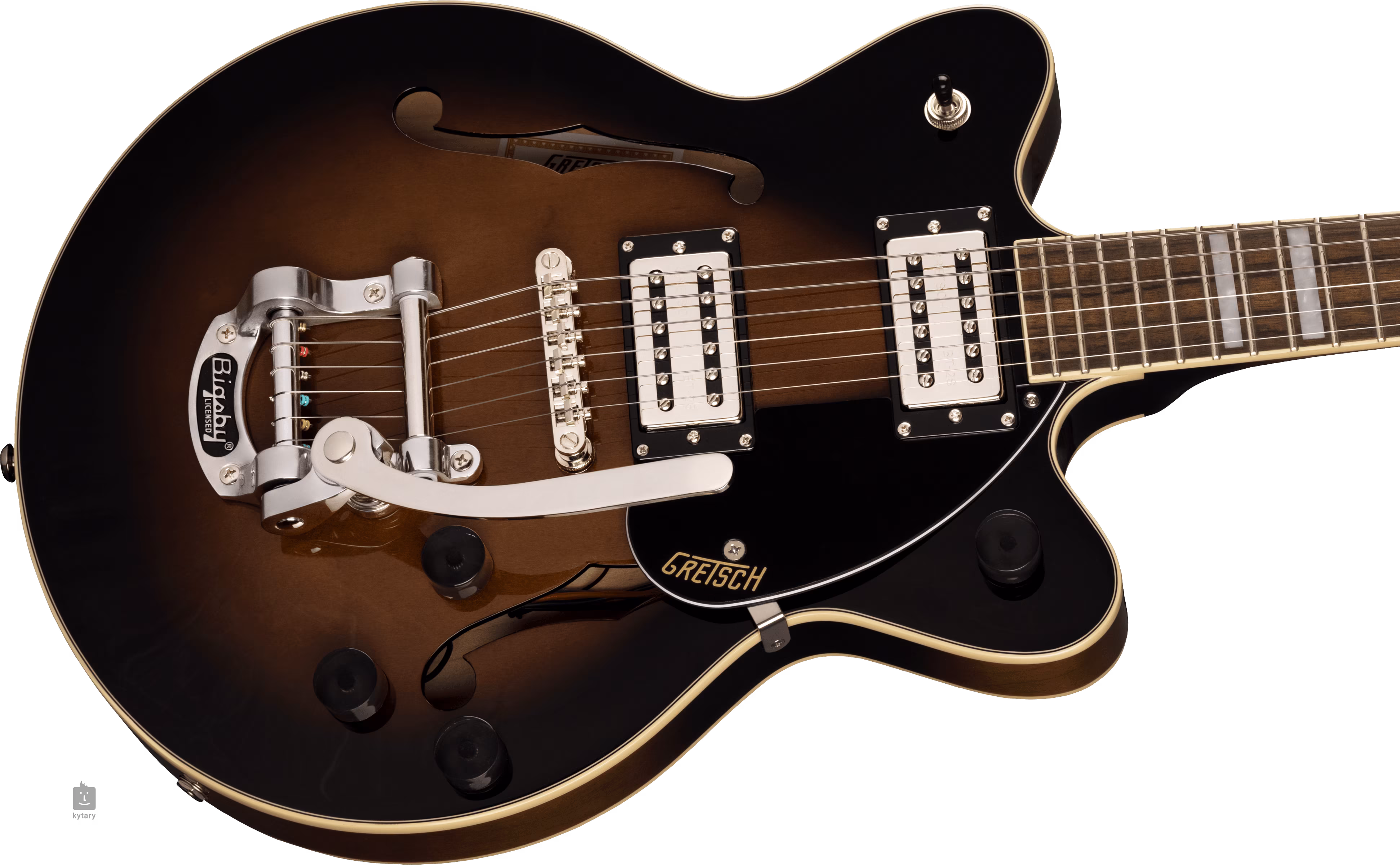 Les cordes sont ancrées via une touche en faux os dans les mécaniques Die-Cast de la société et via un cordier Adjusto-Matic assis sur une base en bois dans un trémolo Bigsby B50 sous licence. Le design classique et agréable a l'oil des guitares Gretsch est accentué par un certain nombre de caractéristiques stylistiques - de la construction de la caisse arquée avec des trous F évasés pour une meilleure projection acoustique, une reliure élégante avec une subtile touche de patine (Aged White) et un pickguard noir et blanc, des potentiometres de style vintage, des ferrures en nickel et un pickguard noir.