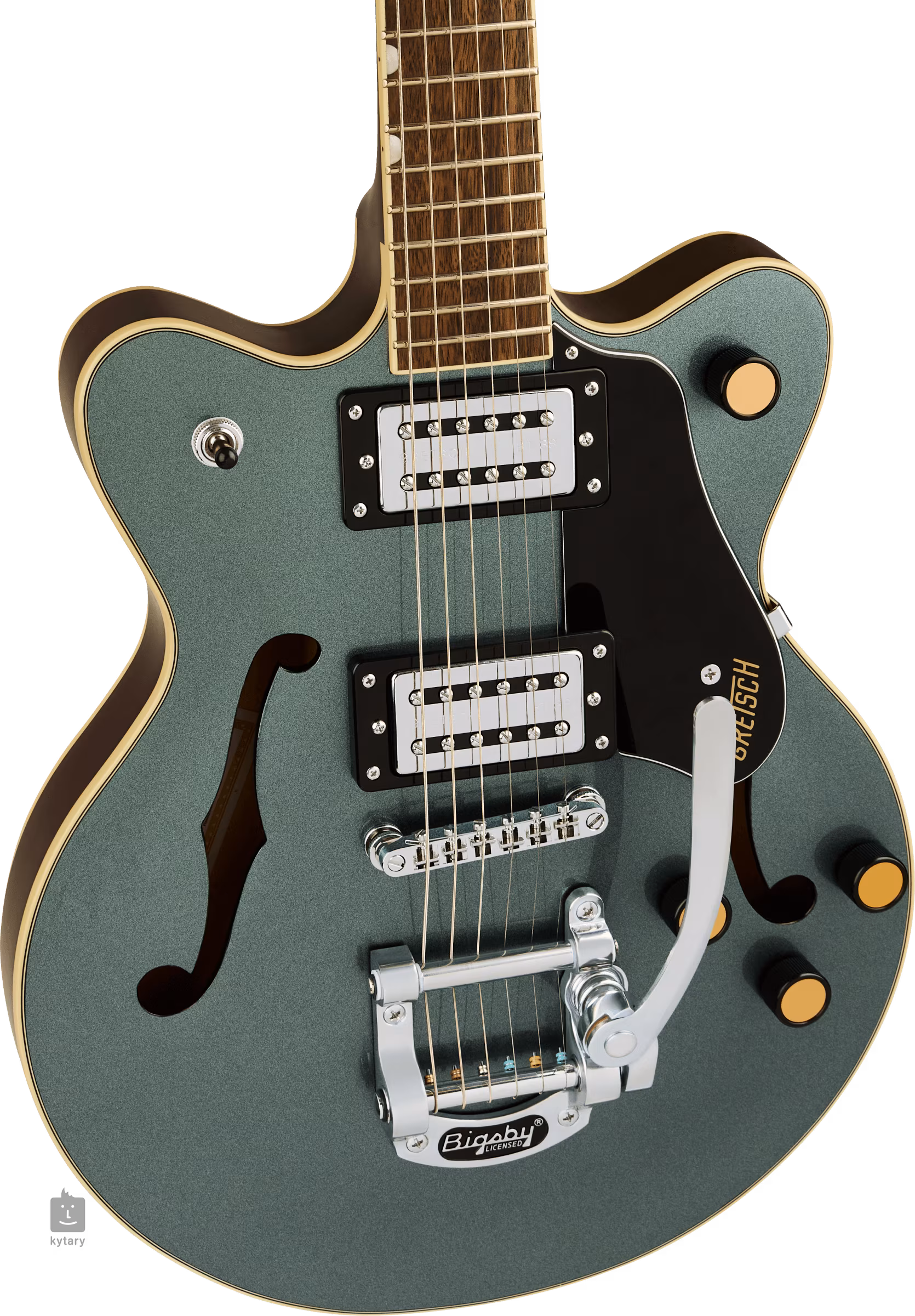 Les cordes sont ancrées par une frette en os dans les mécaniques moulées sous pression de l'entreprise et par un cordier Adjusto-Matic dans un trémolo Bigsby B50 sous licence. Le design classique et agréable à l'œil des guitares Gretsch est accentué par un certain nombre de caractéristiques élégantes - de la construction du corps arqué avec des trous F, de la reliure élégante avec un soupçon subtil de patine (Aged White), de l'accastillage en nickel jusqu'au pickguard noir à trois couches avec le logo Gretsch doré.