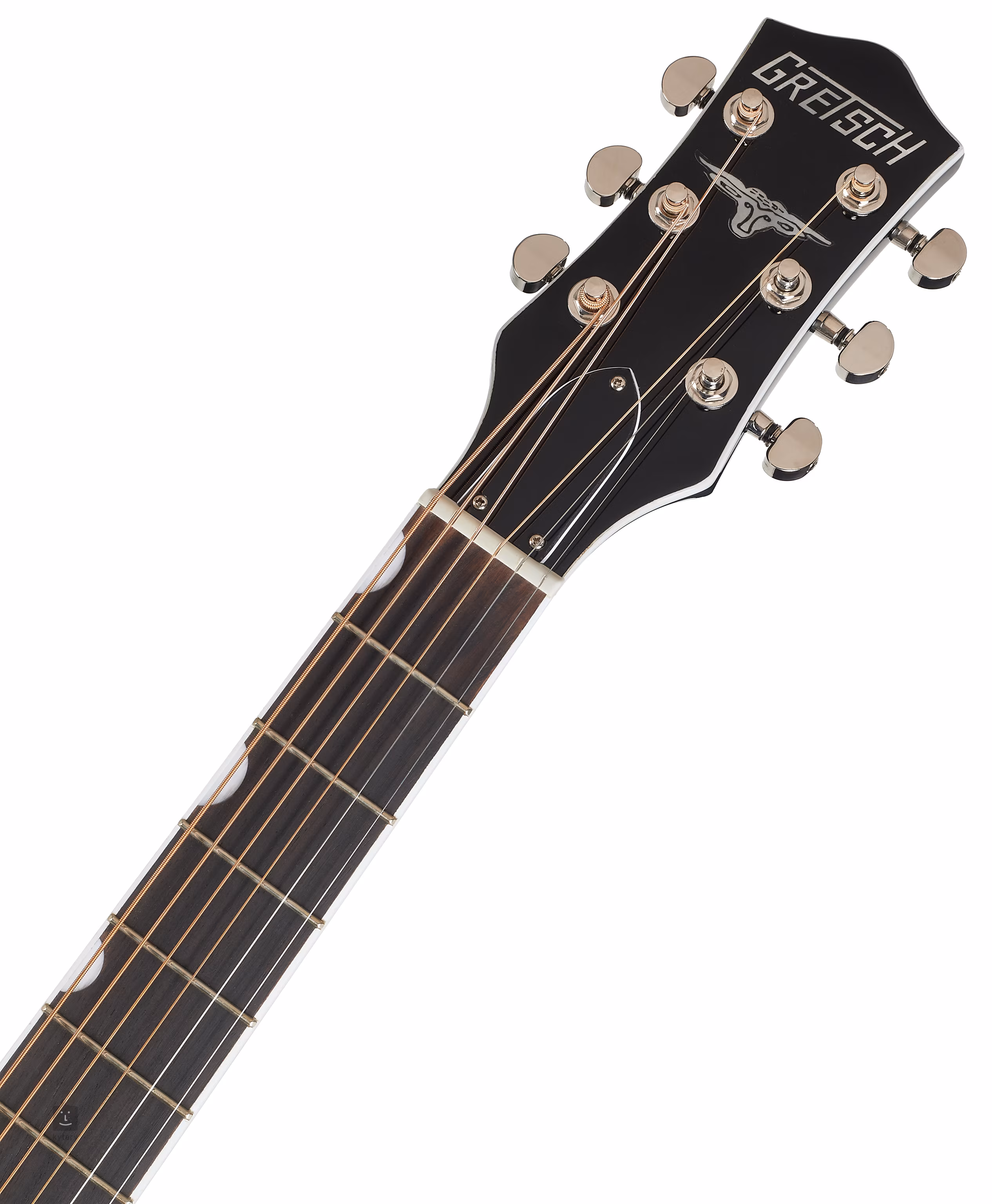 La plaque avant de la G5013CE Rancher Jr. BLK avec un corps plus compact marqué Rancher Jr. est en épicéa laminé, tandis que le dos et les éclisses sont en acajou laminé. La résonance de la table est favorisée par les nervures réduites de type X.