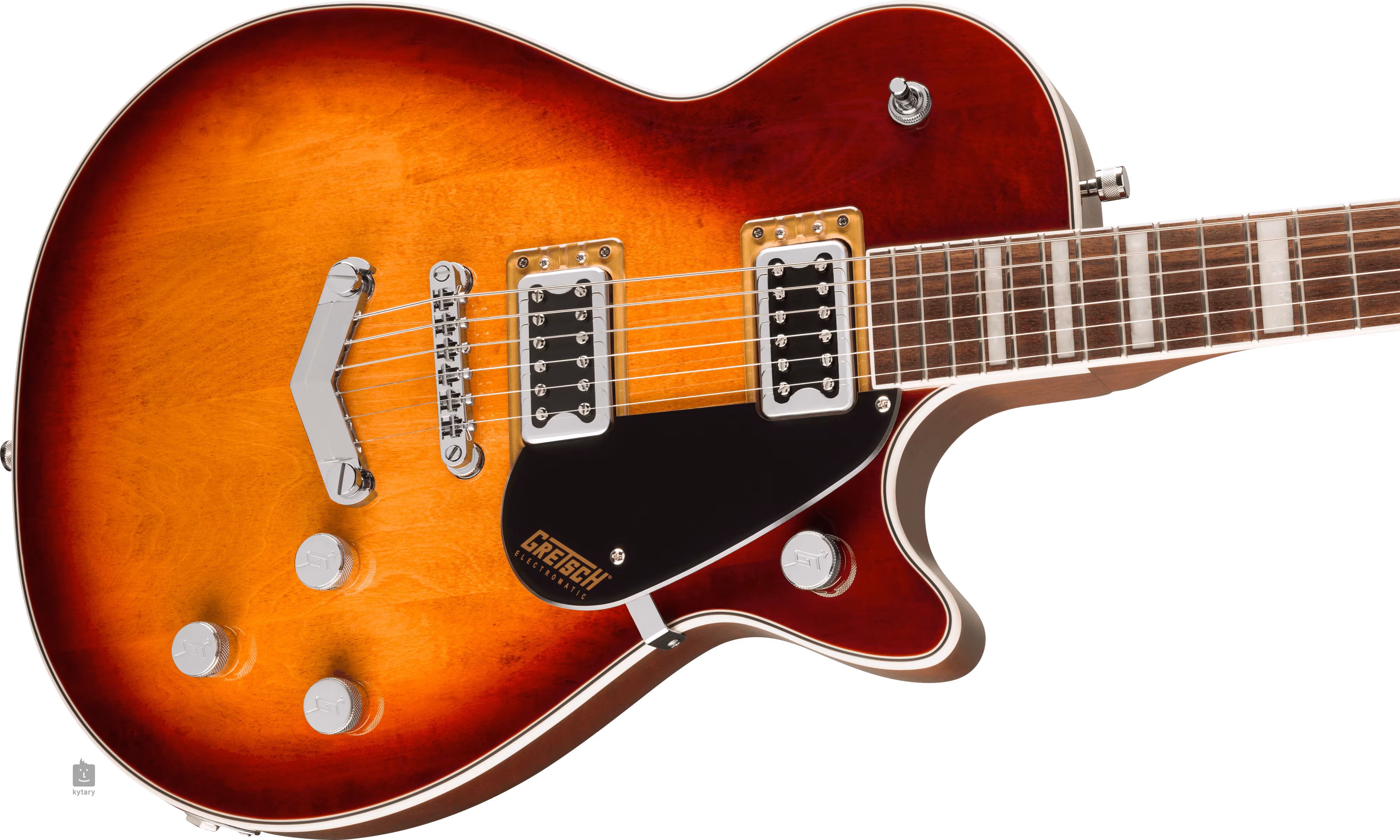 Les cordes sont ancrées par une frette en os synthétique dans les mécaniques moulées sous pression de l'entreprise et par un cordier ajustable Adjusto-Matic dans le V-Stoptail. Le design élégant de l'instrument est accentué par les bordures blanches du corps, complétées par un pickguard noir et blanc, un accastillage chromé et un pickguard en plexi noir avec le logo Gretsch en or.