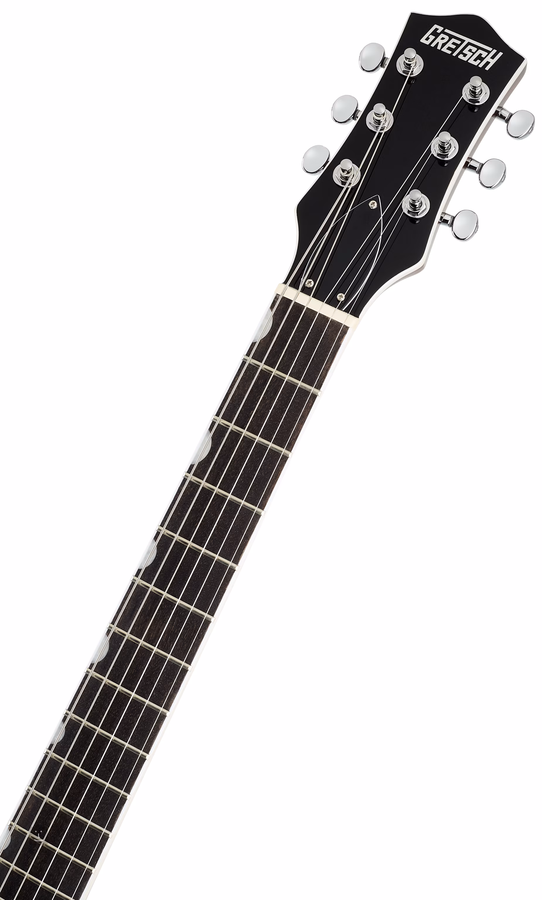 Les cordes sont logées dans les mécaniques d'accordage exclusives de die-cast et le trémolo Bigsby. Le design élégant de l'instrument est complété par des accessoires chromés et un protege-microphone en plexi argenté avec le logo Gretsch noir.