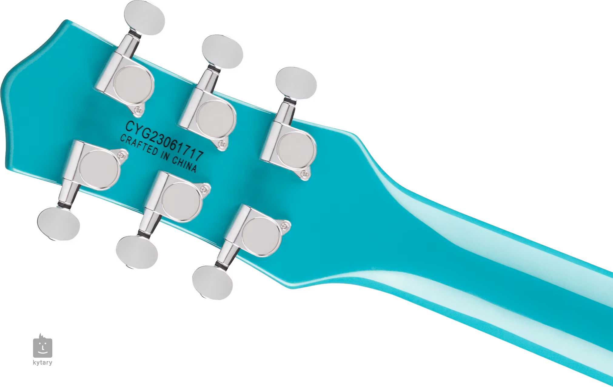 Le corps léger en acajou chambré de la guitare G5232T Electromatic Double Jet FT Caicos Green est recouvert d'une table d'harmonie en érable. Sur le manche en acajou à profil en U fin est collée une touche en figue dotée de vingt-deux frettes Medium Jumbo. L'orientation sur la surface de la touche est facilitée par des repères de position décalés en imitation nacre (Neo-Classic Thumbnail).