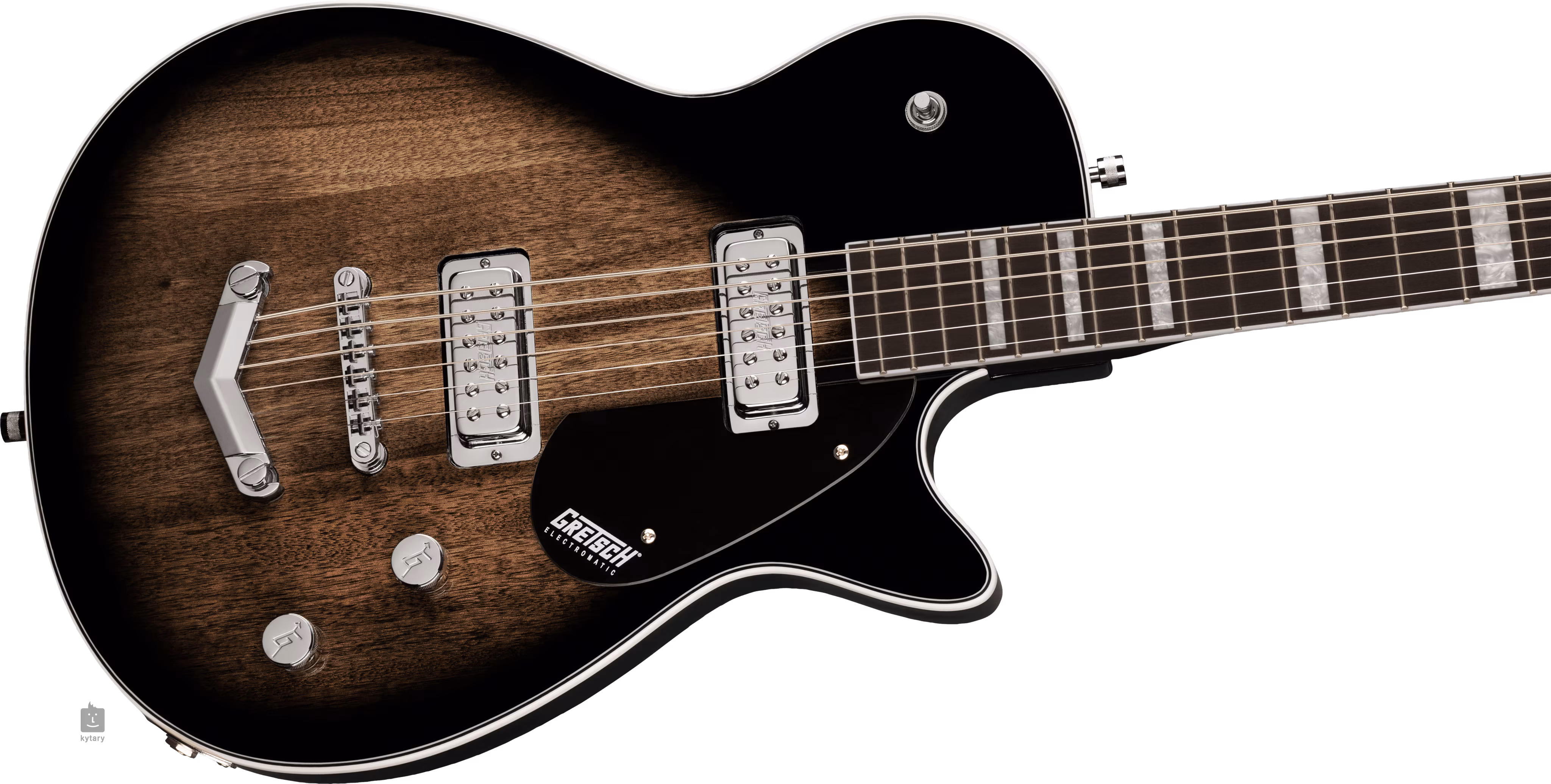 Deux des mini humbuckers de la société fournissent a la guitare un son défini et articulé, meme avec une distorsion plus élevée et un accordage plus prononcé, ce a quoi le manche plus long (756 mm) invite. Des potentiometres de volume, des commandes de tonalité et un commutateur de micro a trois positions permettent de régler le son. Les cordes sont maintenues dans les mécaniques d'accordage Die-Cast de la société, le cordier ajustable Adjusto-Matic et les cordes Gretsch V Stoptail. Le design élégant de l'instrument est accentué par des éléments traditionnels sous la forme d'un contour de caisse brillant complété par des lignes noires et blanches, d'une quincaillerie chromée et d'un pickguard en plexi noir orné d'un logo Gretsch blanc.