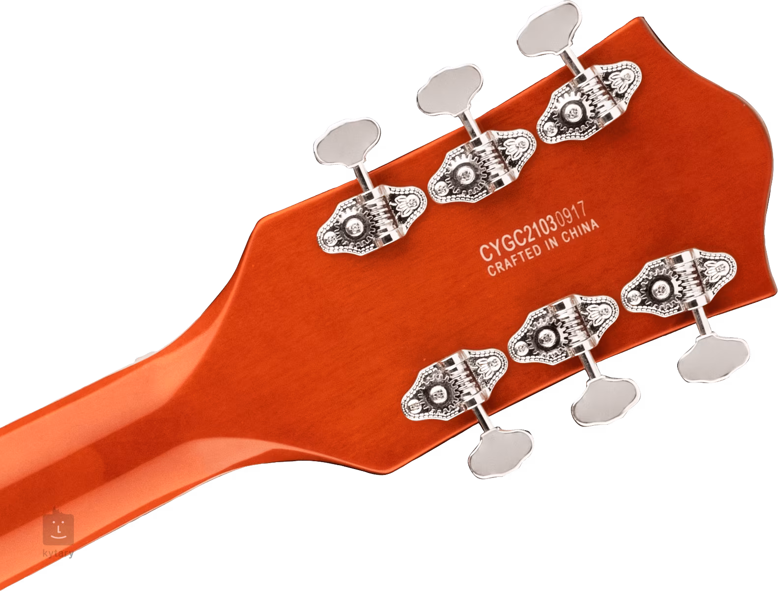 Les cordes sont ancrées par une frette zéro Graph Tech NuBone dans des mécaniques ouvertes de style vintage et un cordier Adjusto-Matic assis sur une base en bois dans les limons. Le design élégant de la guitare est accentué par la finition Orange Stain, le corps et les bordures de tete, le pickguard en plexi argenté avec le logo Gretsch noir et le matériel en nickel.