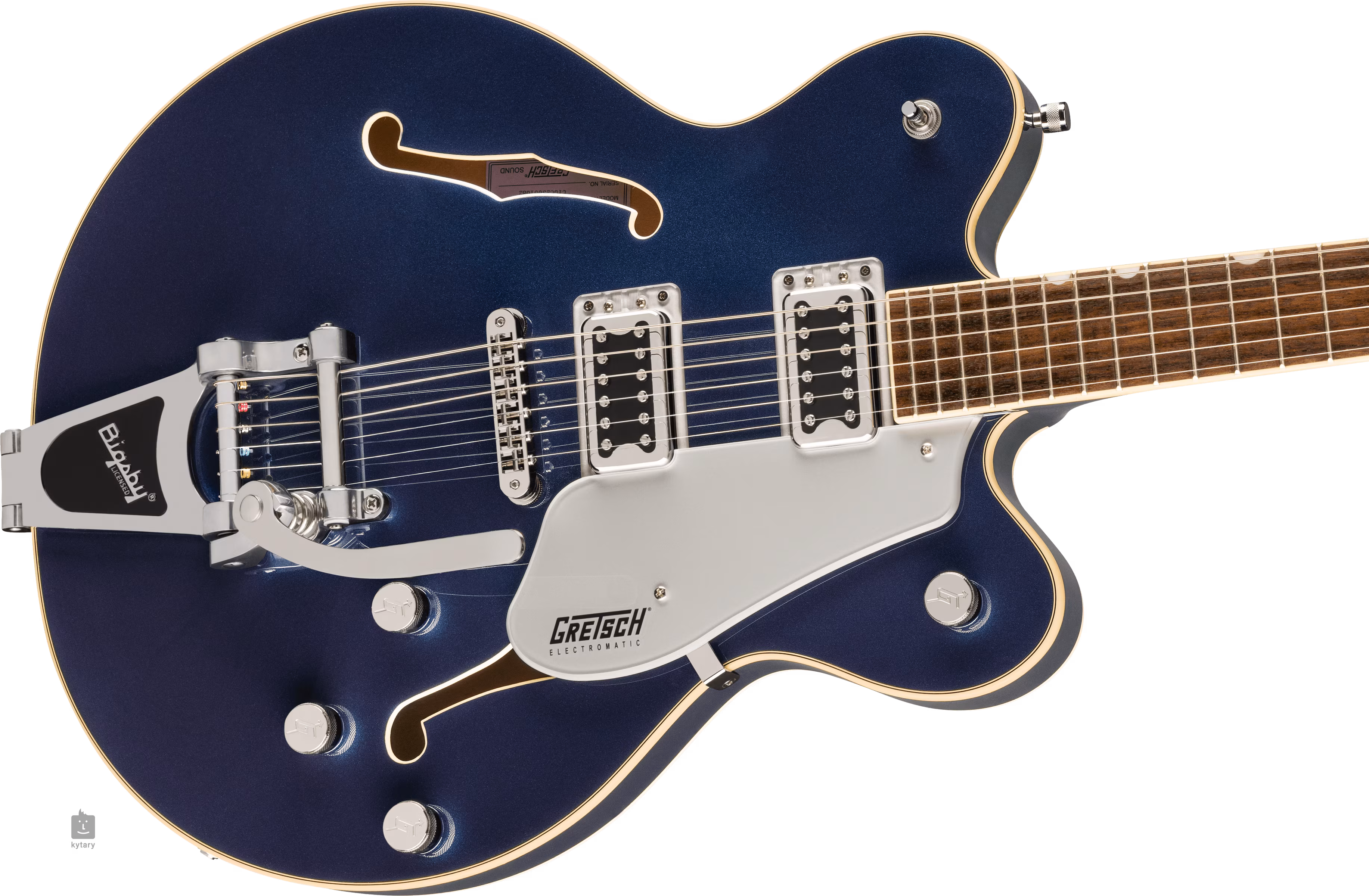 Le corps du modèle G5622T semi-hollow double-cut est fabriqué en érable surmoulé avec un bloc central en épicéa chambré qui renforce la table d'harmonie de la guitare. La touche en bois de figuier, dotée de vingt-deux frettes Medium Jumbo, est collée sur le manche en érable au profil Thin "U". L'orientation sur la surface de la touche est facilitée par des repères de position décalés en imitation nacre (Neo-Classical Thumbnail).