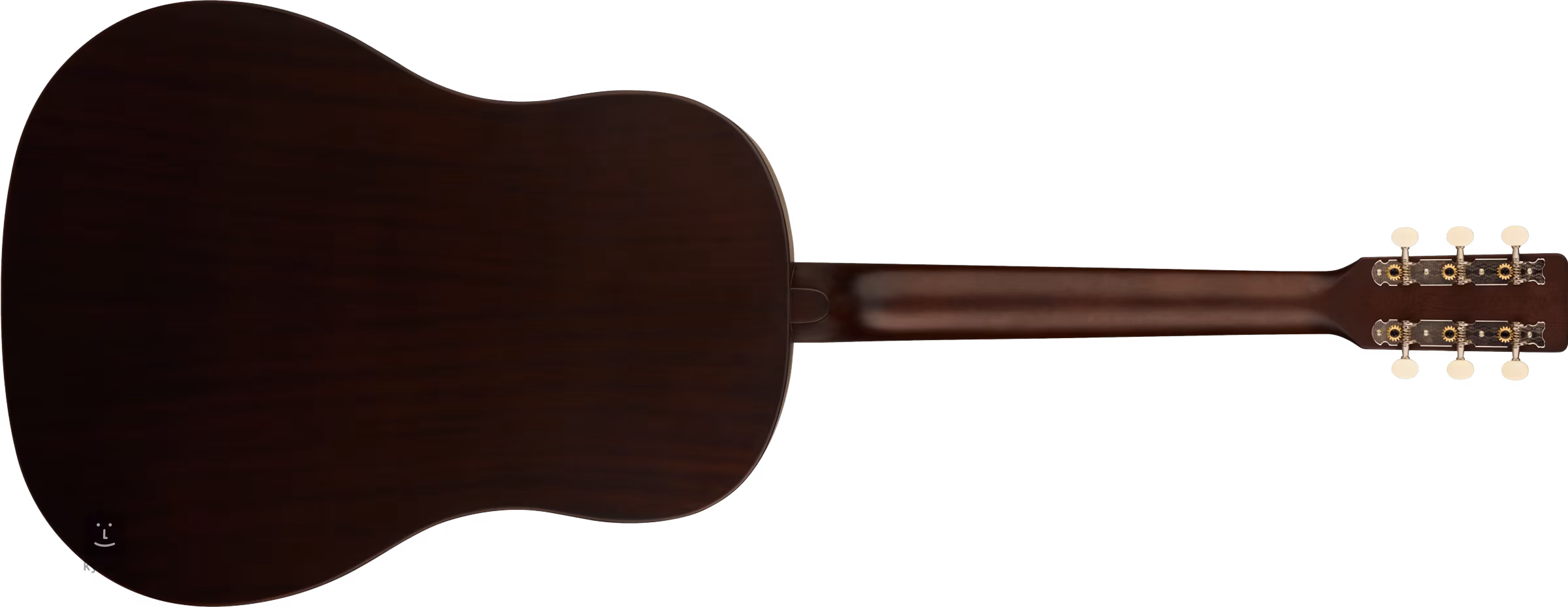 Le corps de la Jim Dandy Dreadnought Deep Cherry Burst est en sapelli laminé. Une touche en noyer avec 20 frettes est collée sur un manche en nato avec un profil en "C". La bonne résonance du corps est soutenue par les traditionnelles nervures en X, tandis que l'orientation sur la touche est facilitée par des points de positionnement en imitation nacre. Les cordes sont maintenues par un mécanisme à pignon ouvert moulé sous pression et une touche en noyer grâce à la frette zéro et au sillet compensé en os synthétique. Le look élégant de la guitare est accentué par une finition Deep Cherry Burst sur la table d'harmonie, un pickguard noir simple couche avec logo "G" doré, des bordures de périmètre blanc vieilli et un accastillage en nickel.