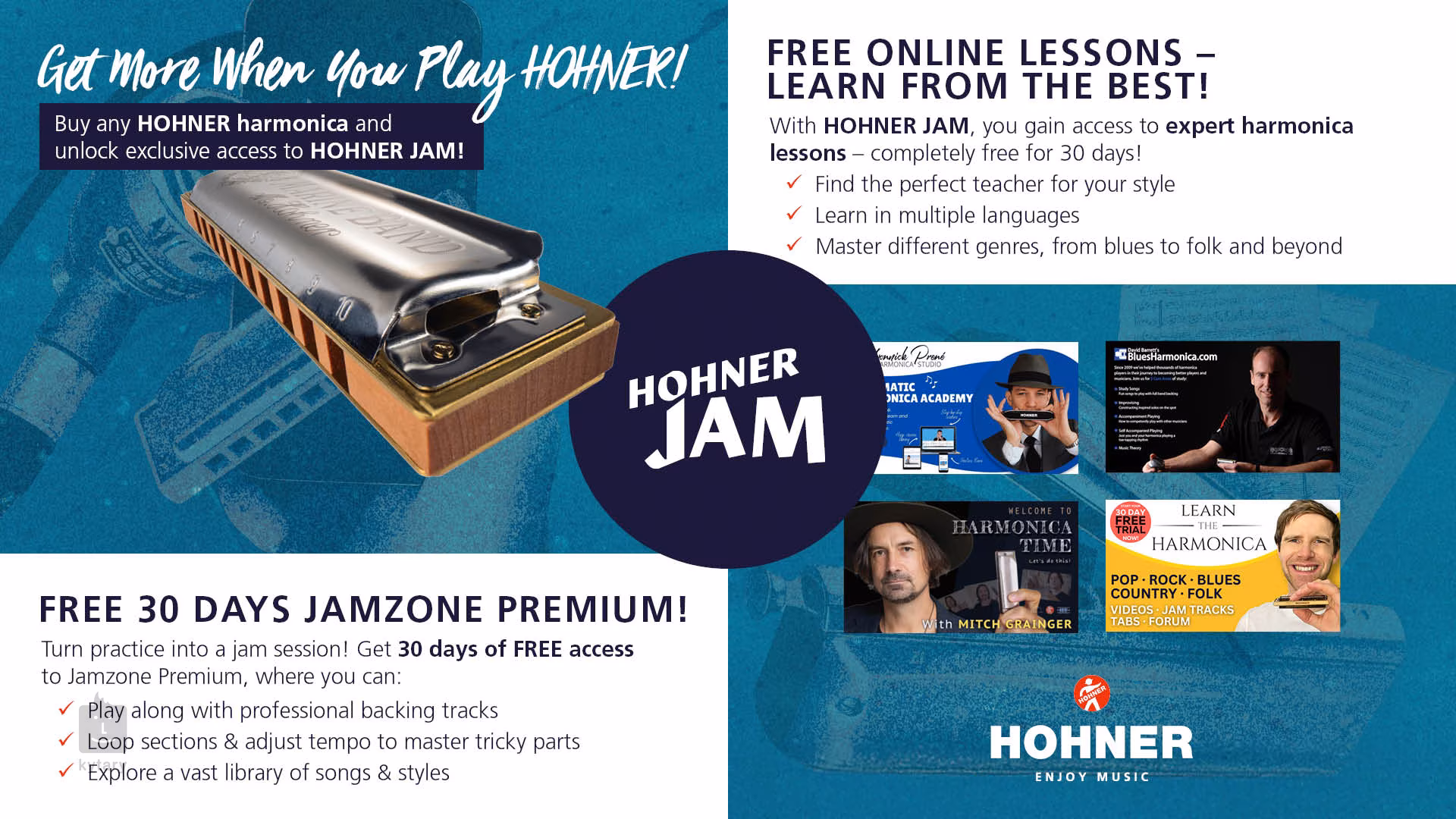 En achetant cet harmonica, vous aurez accès pendant trente jours aux leçons d'harmonica de votre choix tout à fait gratuitement. Vous recevrez également un accès de trente jours à un compte premium sur l'application Jamzone où vous pourrez apprendre et pratiquer de nouvelles chansons. Lors de la création de votre compte Jamzone, entrez le code du bon ci-joint dans la section paiement et les leçons sont à vous ! Les leçons et l'application sont en anglais.