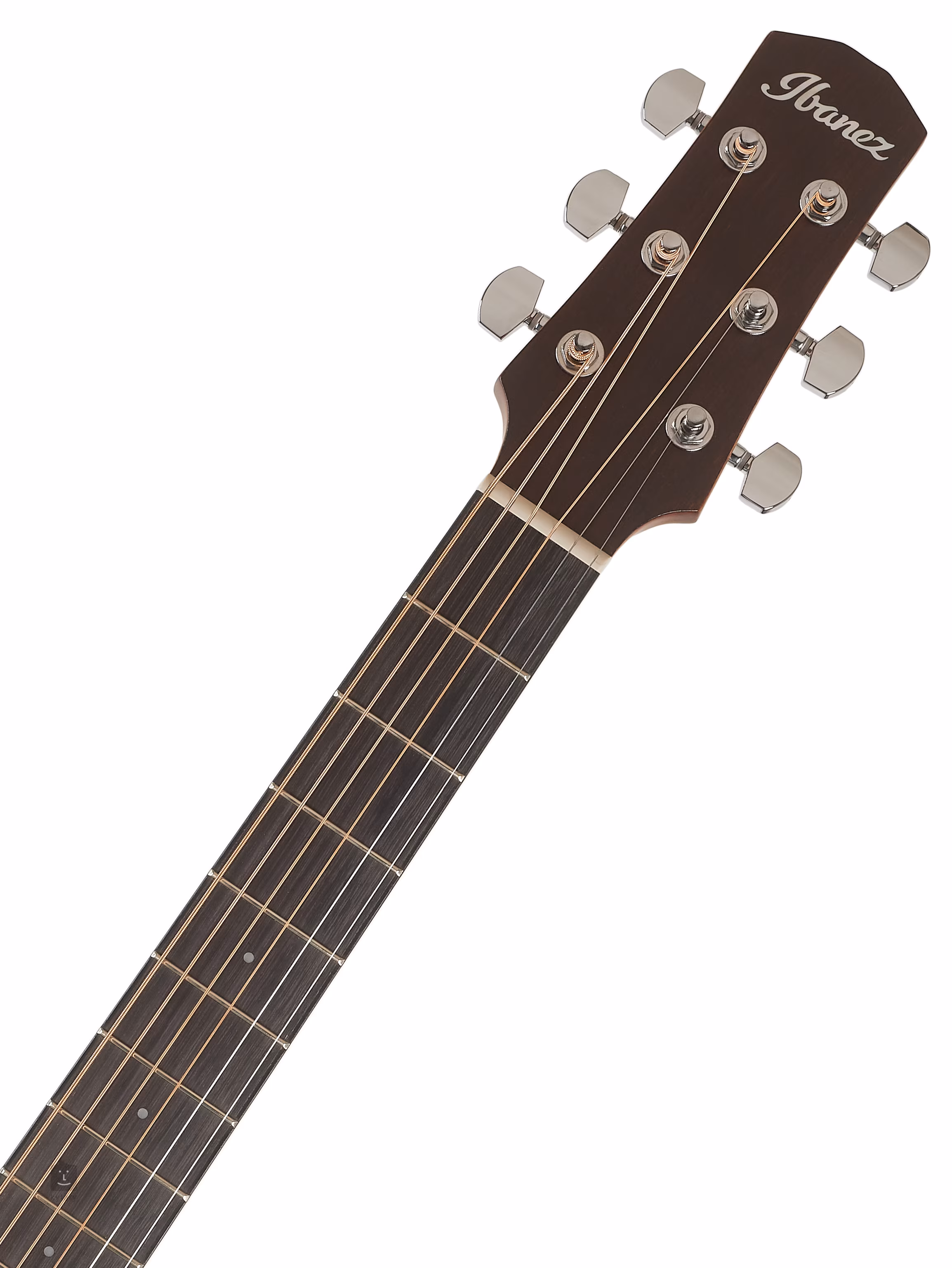 Les cordes sont ancrées par une frette zéro en plastique et un sillet en chrome Die-Cast avec un rapport de transmission de 18:1 et une tête en purpleheart. Les chevilles Advantage d'Ibanez offrent l'avantage d'une manipulation facile et d'un ajustement solide des cordes par rapport aux modèles standard. Le look élégant de l'instrument est accentué par la finition Transparent Charcoal Burst Low Gloss de la table et les éléments traditionnels sous la forme d'une rosace composée d'anneaux noirs et blancs et d'un pickguard.