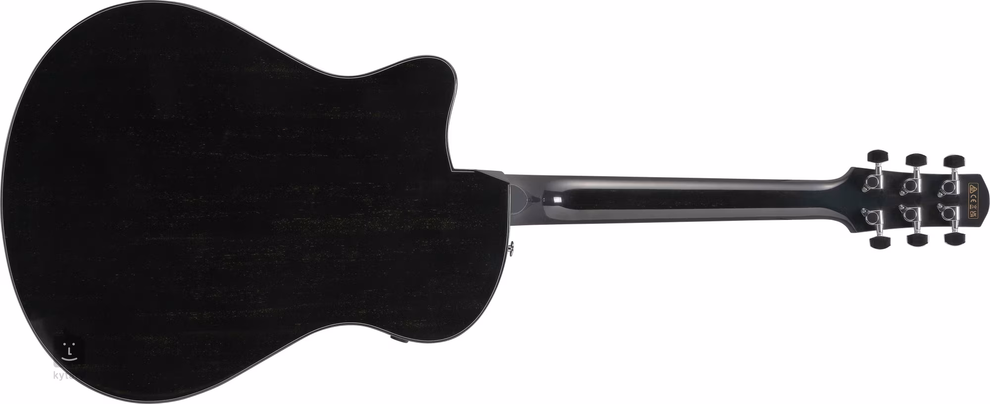 Le look élégant de l'instrument est accentué par des éléments traditionnels sous la forme d'un contour de corps noir et d'une rosace composée de nacre (abalone) et d'anneaux de bois.
