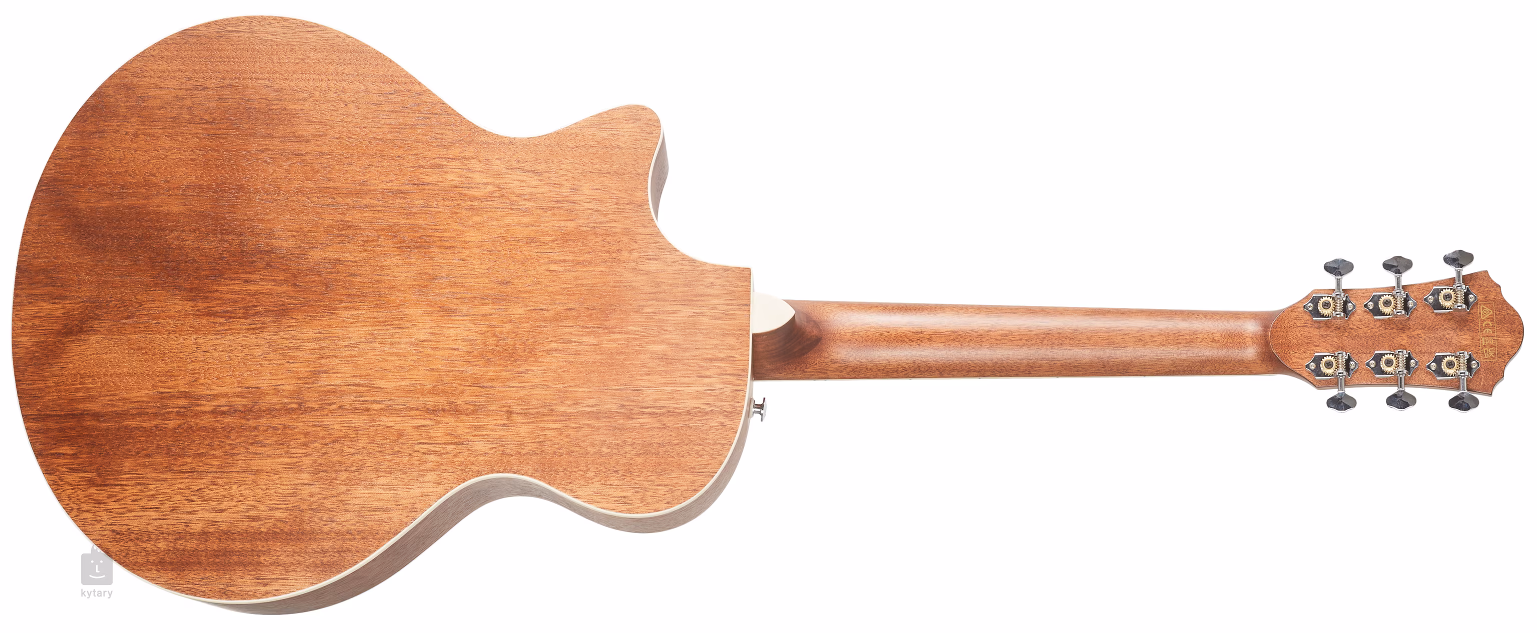 L'AE240JR-MHS est un modèle à diapason court avec un diapason plus court et un corps plus petit. La table est en okoumé massif, tandis que le dos et les éclisses sont en okoumé surmoulé. La résonance de la table est favorisée par les nervures réduites en X festonné. Une touche en ovangkol à 20 frettes est collée sur le manche en bois exotique de nyatoh. Un pan coupé inférieur pratique permet de jouer facilement sur les positions les plus élevées de la touche.