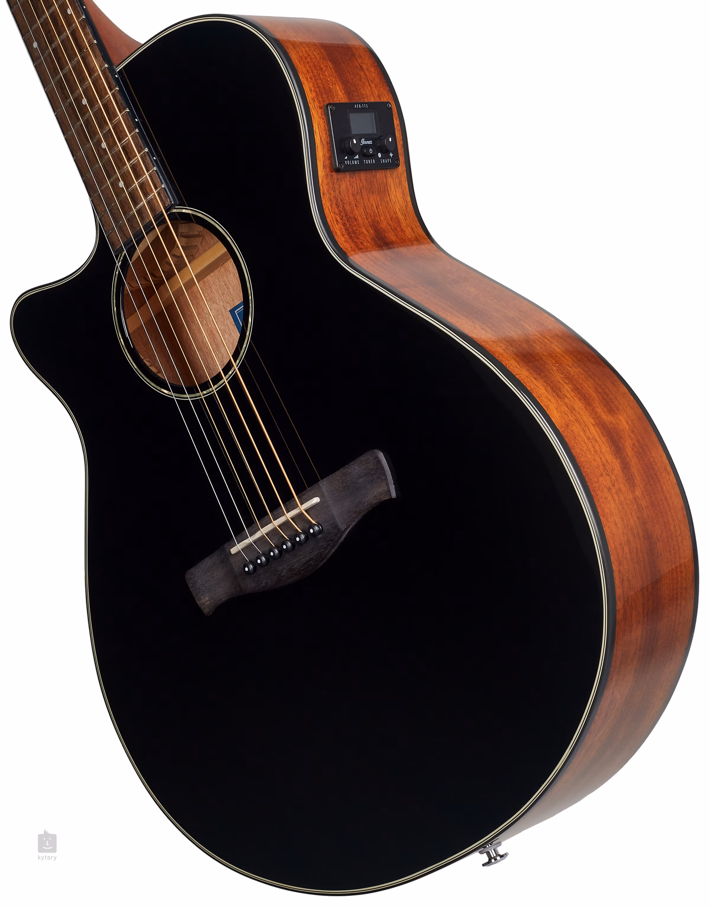 Un volume suffisant pour les besoins d'une performance publique ou d'un groupe est fourni par l'électronique Ibanez AEQ-TTS avec un accordeur intégré dans le soufflet de la guitare et un micro piezo sous le bloc. Les cordes sont montées dans des mécaniques d'accordage chromées Die-Cast et une touche en noyer. Les chevilles de la tete de l'Ibanez Advantage offrent des avantages par rapport aux modeles standard en termes de facilité de manipulation et de fixation ferme des cordes. Le beau design de l'instrument est accentué par la garniture et la rosace noires et blanches, qui contrastent avec la couleur de la carrosserie.