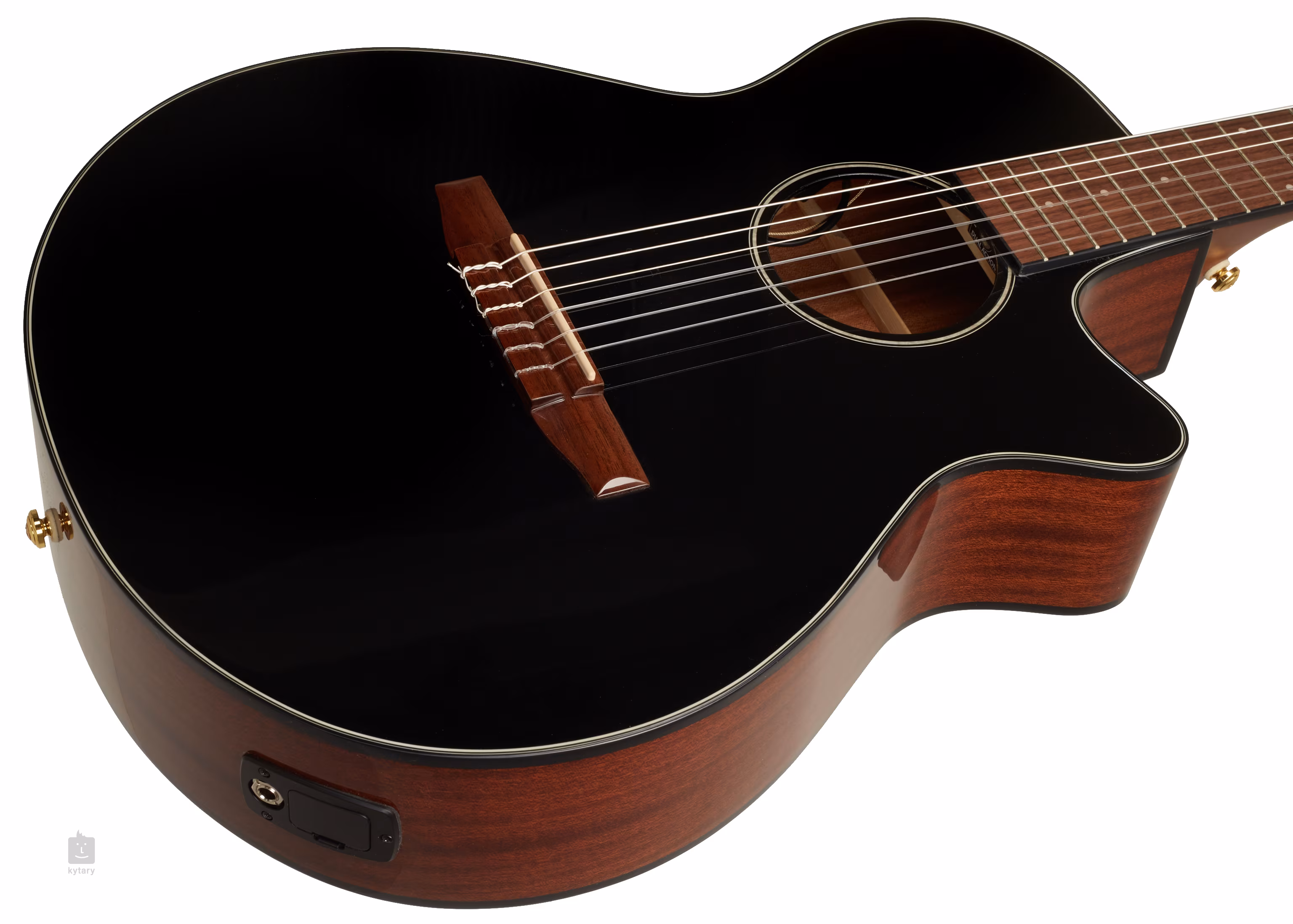 L'AEG50N-BKH est une guitare électro-acoustique classique qui combine la construction moderne du corps des guitares électro-acoustiques AEG avec le son des cordes en nylon. Le corps de la guitare est constitué d'un panneau avant en épicéa et d'un fond et d'éclisses en sapelli africain, dont l'apparence et les caractéristiques sont similaires a celles de l'acajou véritable. Une touche en noyer avec vingt frettes est collée sur le manche en nyatoh. La découpe inférieure du corps offre une bonne prise de la touche meme aux positions les plus élevées du manche, l'orientation sur sa surface est facilitée par des points de position blancs.