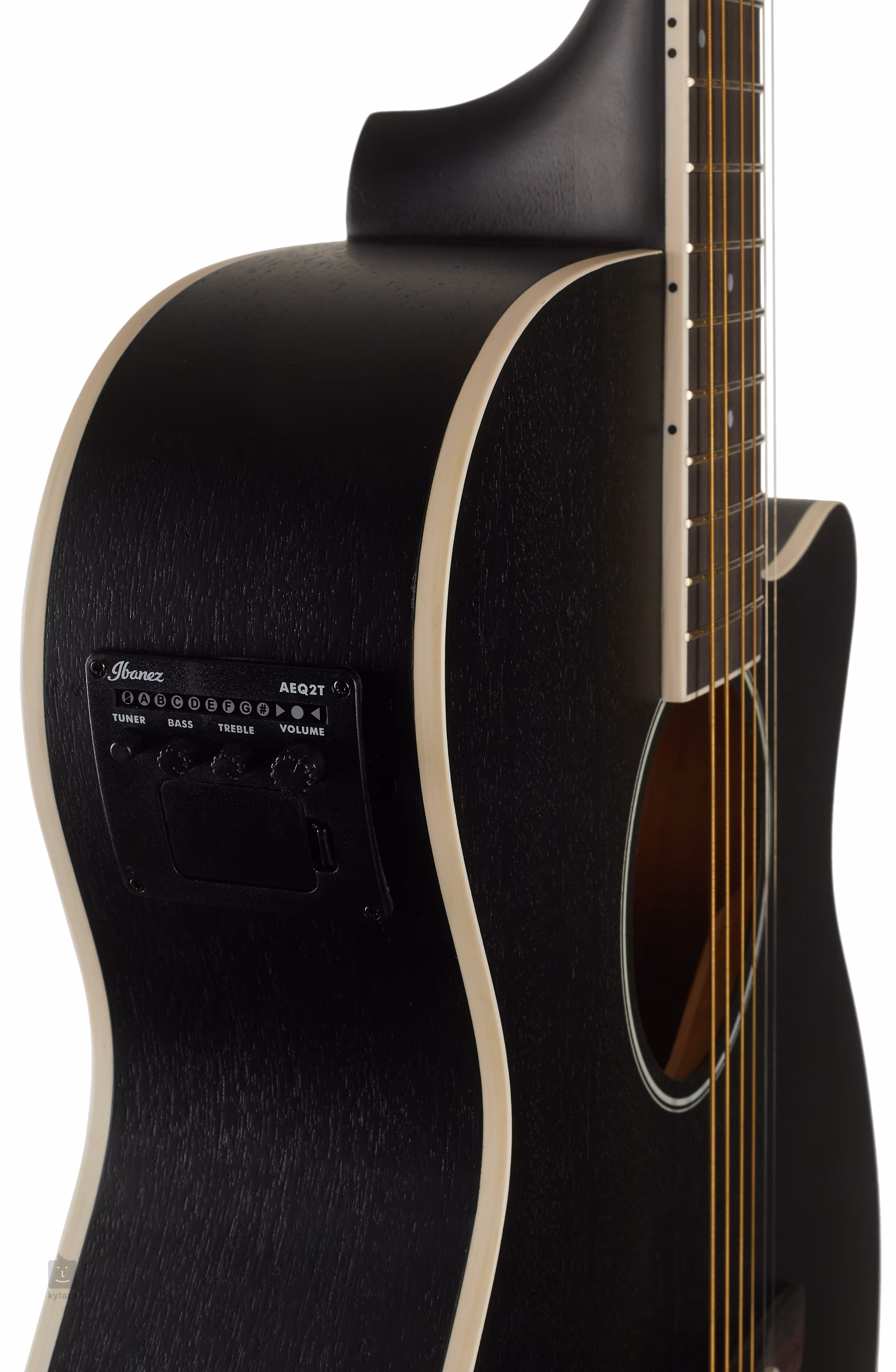 L'électronique Ibanez AEQ-2T, avec un accordeur intégré au soufflet de la guitare et un micro piézo sous le bloc, fournit un volume suffisant pour les besoins d'une prestation en public ou pour jouer avec un groupe. Les cordes sont logées dans des mécaniques chromées Die-Cast et une touche en purpleheart. Les chevilles Advantage Ibanez situées dans la tête de la guitare offrent des avantages par rapport aux modèles standard en termes de facilité de manipulation et de fixation des cordes.