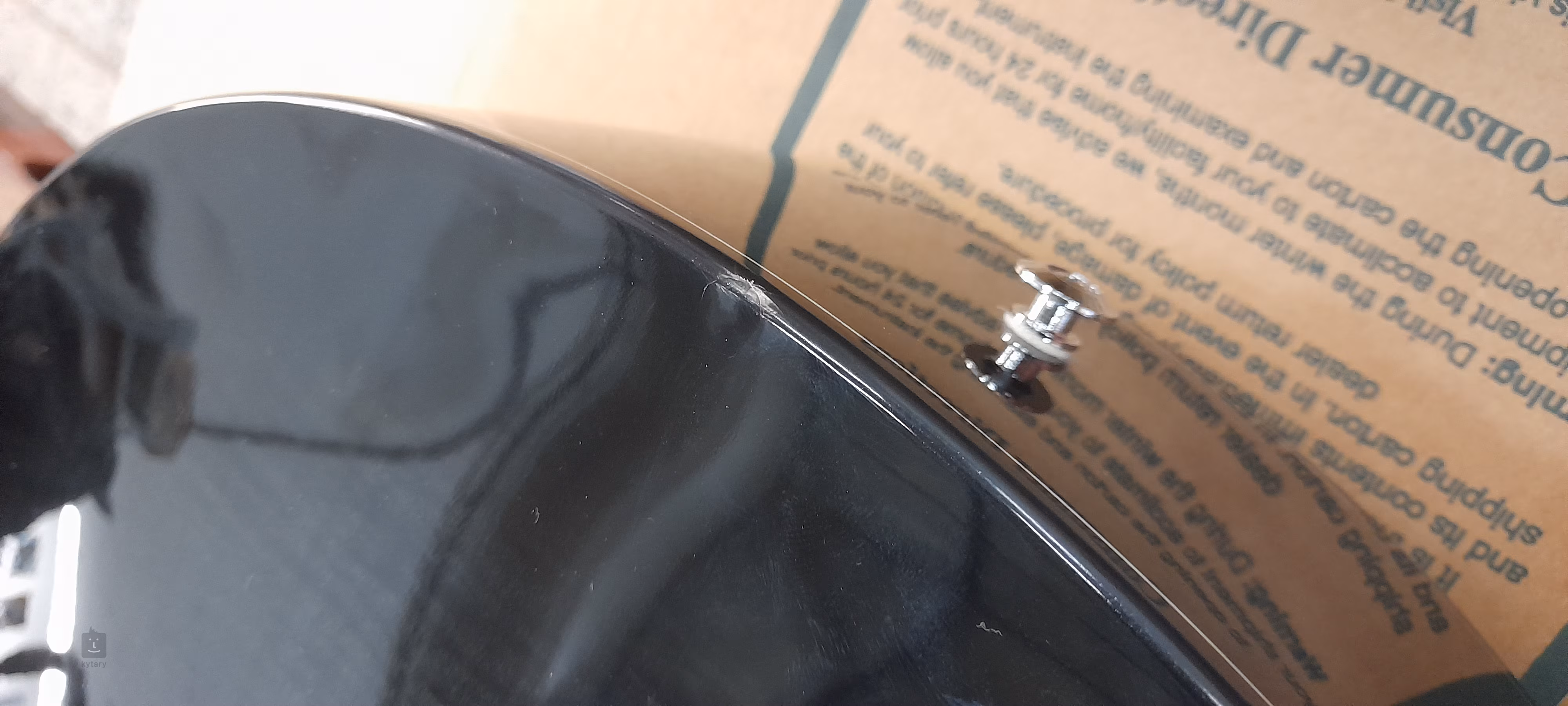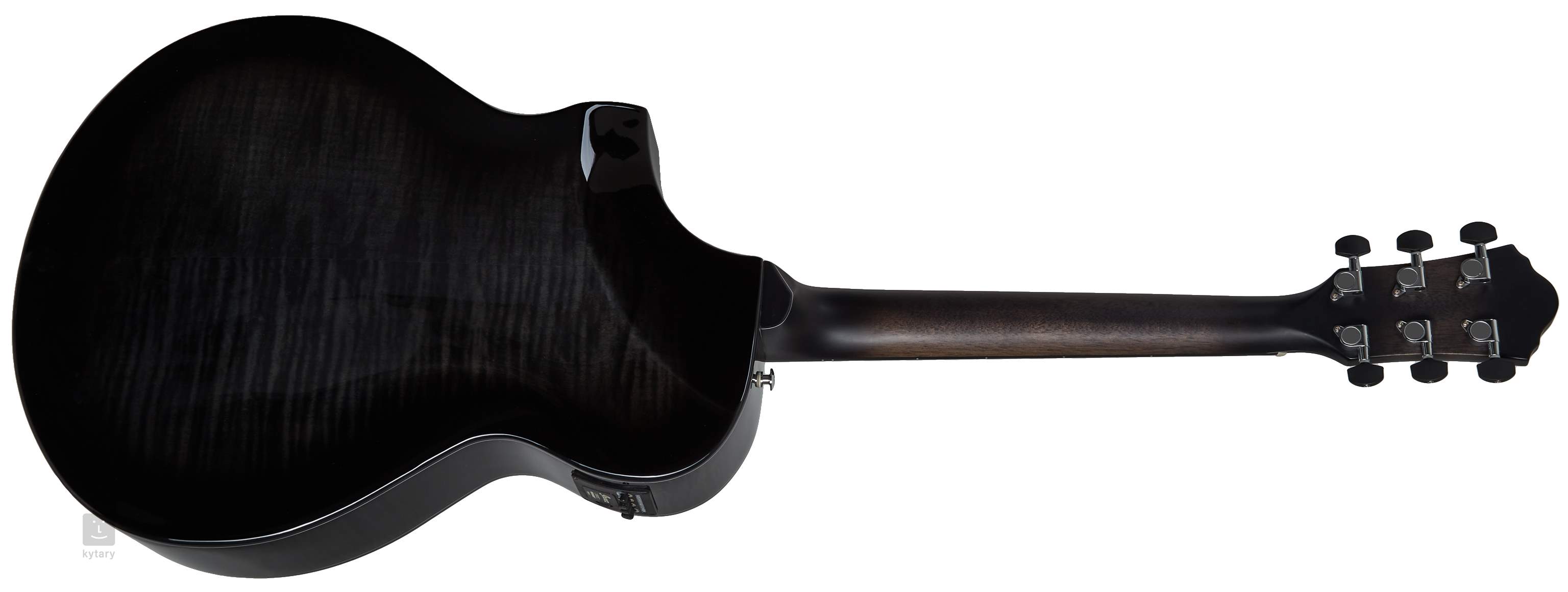 Les cordes sont maintenues dans des mécaniques chromées Die-Cast avec des chevilles noires et une touche en noyer. Le design de la guitare est accentué par la reliure du corps et la rosace en nacre.
