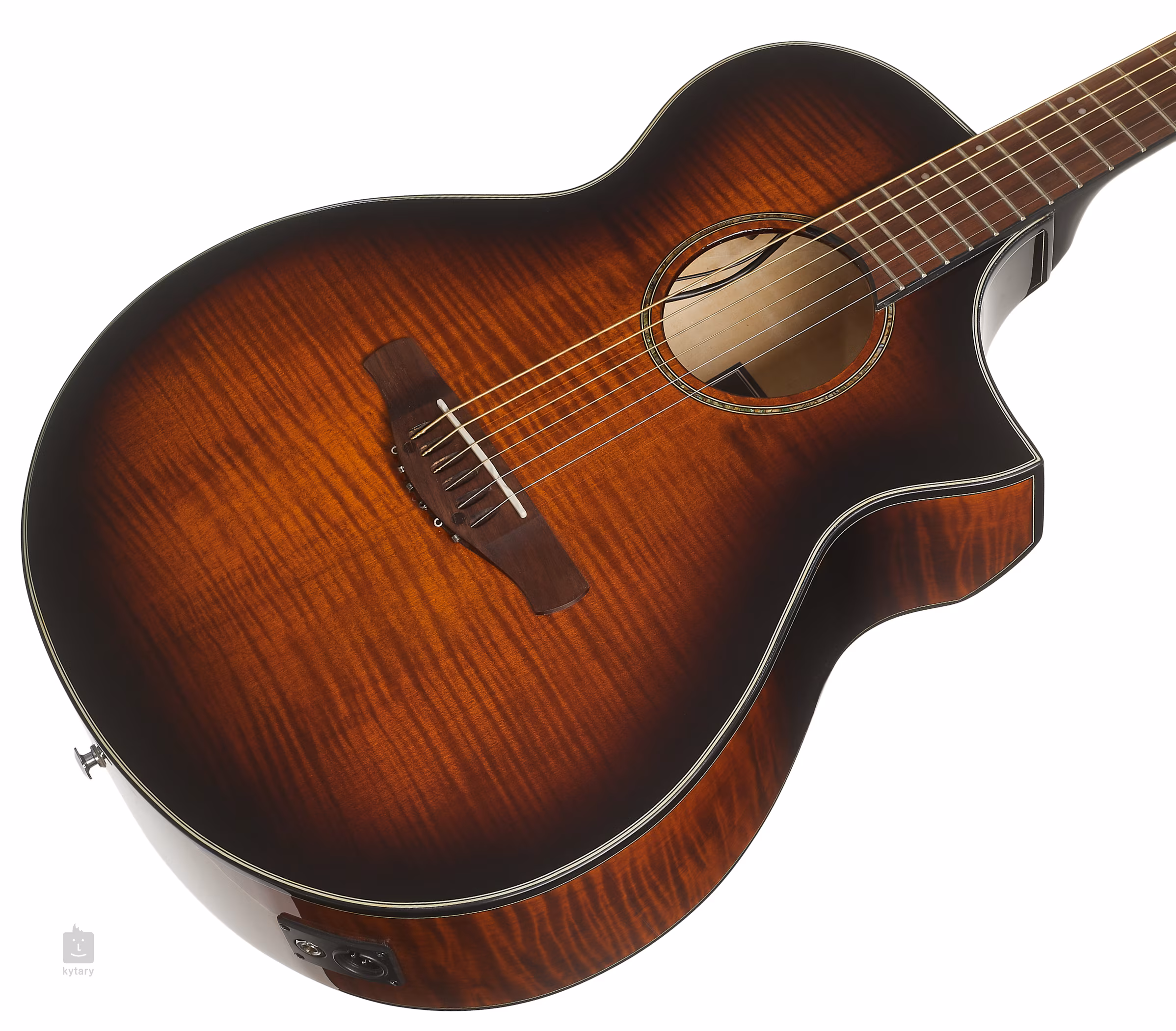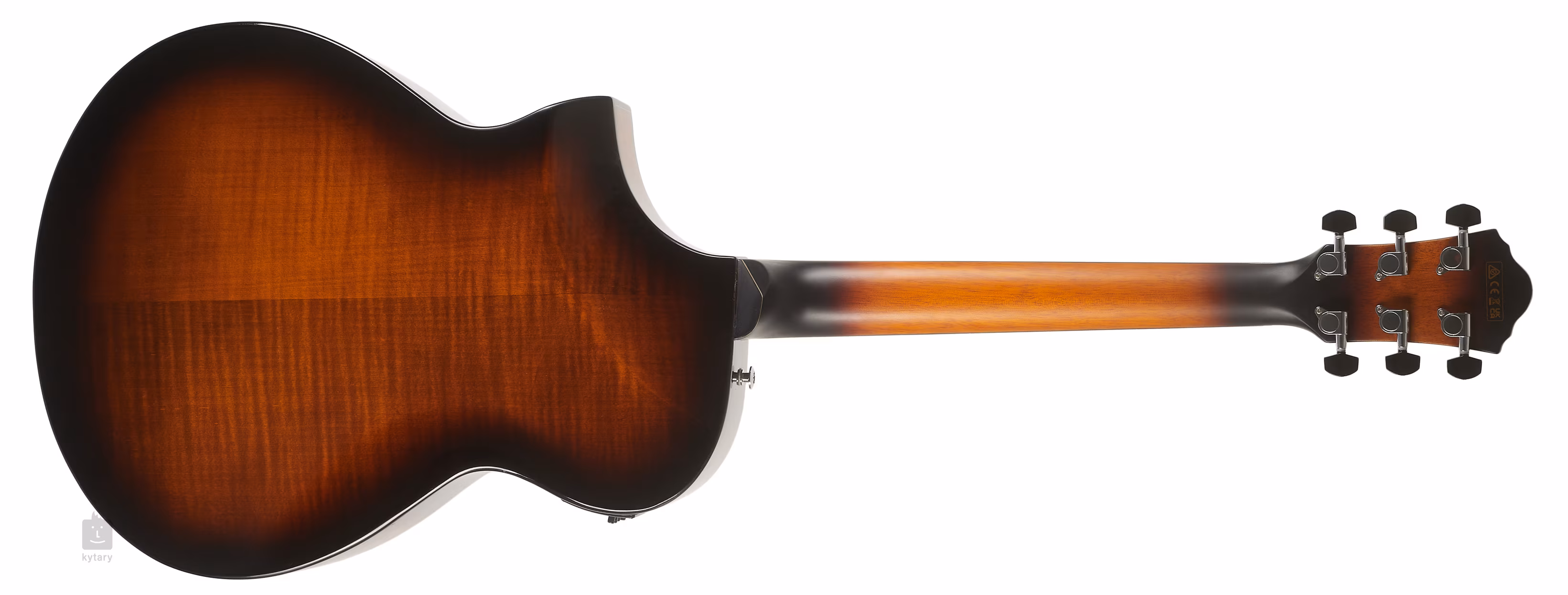Le corps étroit de 10 cm de large de la guitare électroacoustique AEWC400-AMS, au design moderne à simple coupe, est fabriqué en érable stratifié. La finition laquée brillante et la couleur Amber Sunburst mettent en valeur l'érable figuré. Le manche en bois exotique de nyatoh est surmonté d'une touche en palissandre dotée de vingt frettes et de points de positionnement décalés. La forme ergonomique du corps et la découpe fine du bas du corps (Florentine) offrent un confort de jeu optimal.