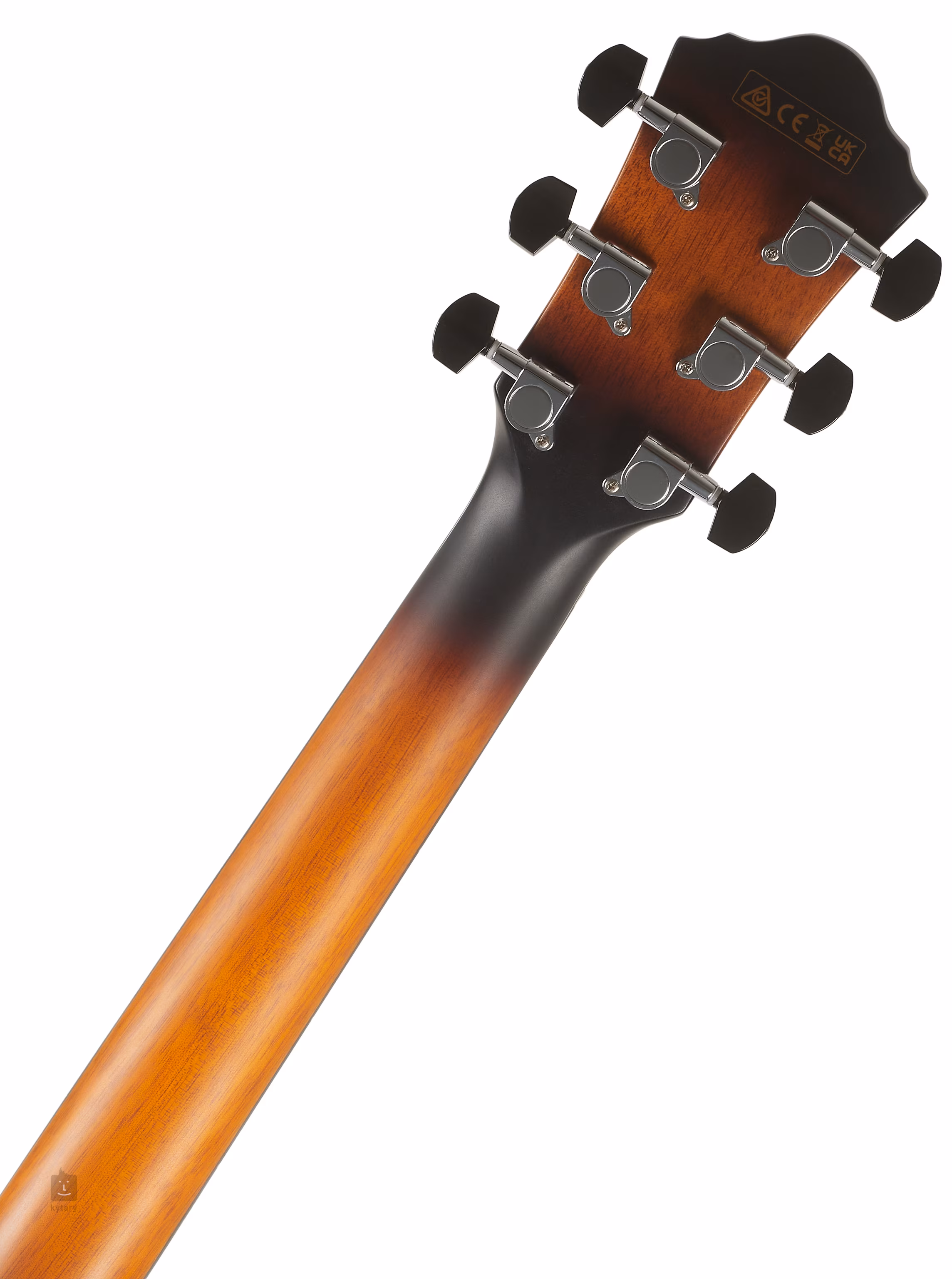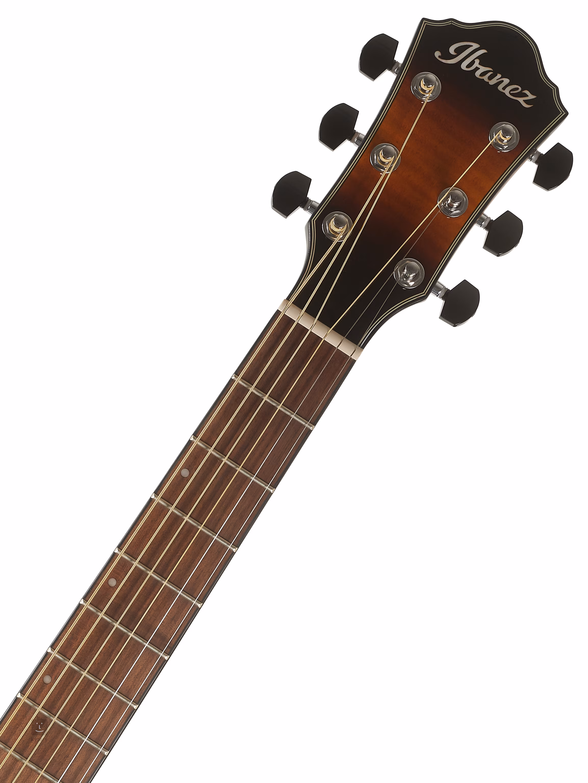 L'électronique Ibanez AEQ-SP2 avec accordeur intégré et micro piézo Fishman S-Core assure un volume suffisant pour les besoins d'un concert public ou d'un groupe. Les deux sorties de l'instrument, une XLR symétrique et un jack traditionnel de 6,3 mm, résolvent tous les problèmes liés aux câbles d'interconnexion et aux jacks des guitares acoustiques - vous serez tout simplement toujours "prêt". Les cordes sont maintenues par des mécaniques chromées moulées sous pression avec chevilles noires et touche en palissandre. La finition élégante est accentuée par l'habillage double face du corps et la rosace en nacre (abalone).