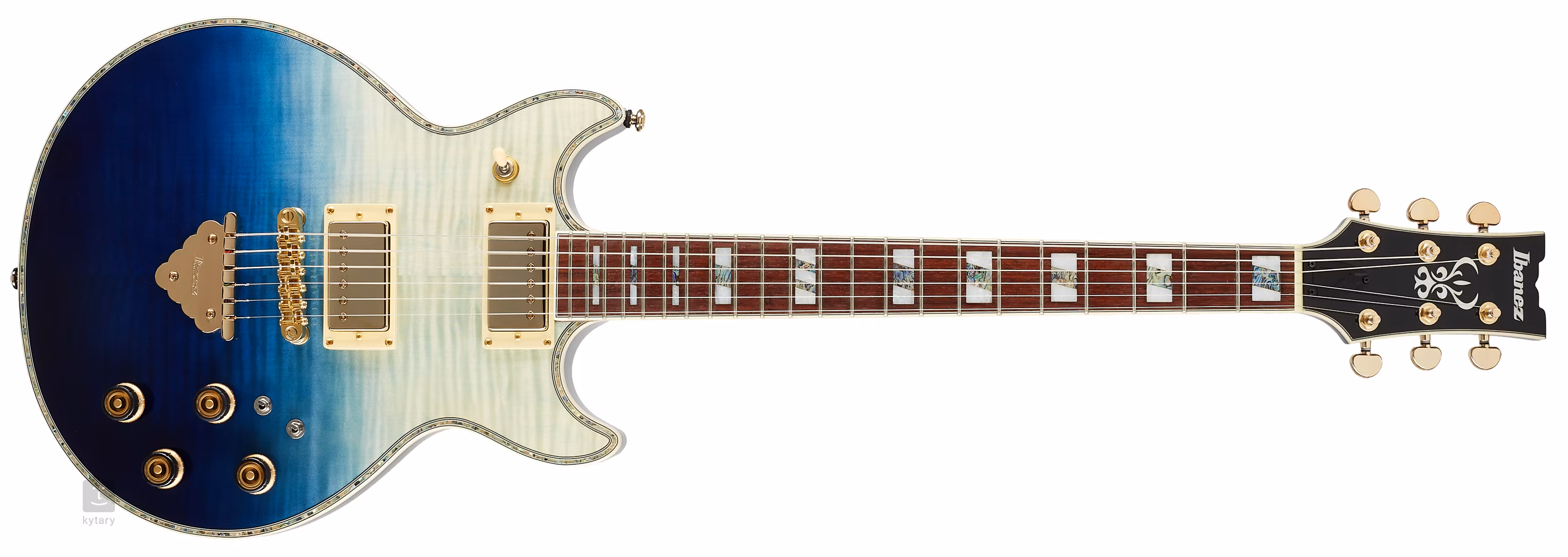 Le corps en okoumé du modele AR420-TBG est orné d'un spectaculaire placage de table en érable figuré dont le motif est soutenu par une finition en dégradé de bleu transparent. Collée sur le manche en érable en trois parties, une touche en jatoba est équipée de vingt-deux frettes de taille moyenne. Les blocs de position en imitation nacre et ormeau facilitent l'orientation sur la surface de la touche.
