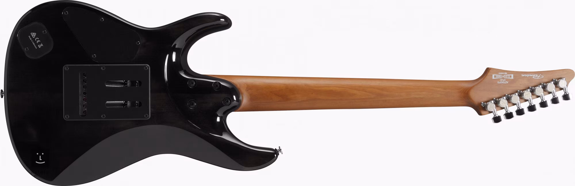 Le corps en tilleul du modele AZ427P1PB-CKB a sept cordes présente un placage de table en loupe de peuplier avec un grain de bois mis en valeur par une finition Charcoal Black Burst. Le manche en érable est collé a une touche en palissandre équipée de vingt-quatre frettes jumbo en acier inoxydable. Le traitement thermique du manche renforce ses caractéristiques tout en donnant a la guitare l'aspect et le toucher d'un instrument mature/joué. L'orientation sur la surface de la touche est facilitée par des points de position en nacre et des reperes luminescents sur le côté.