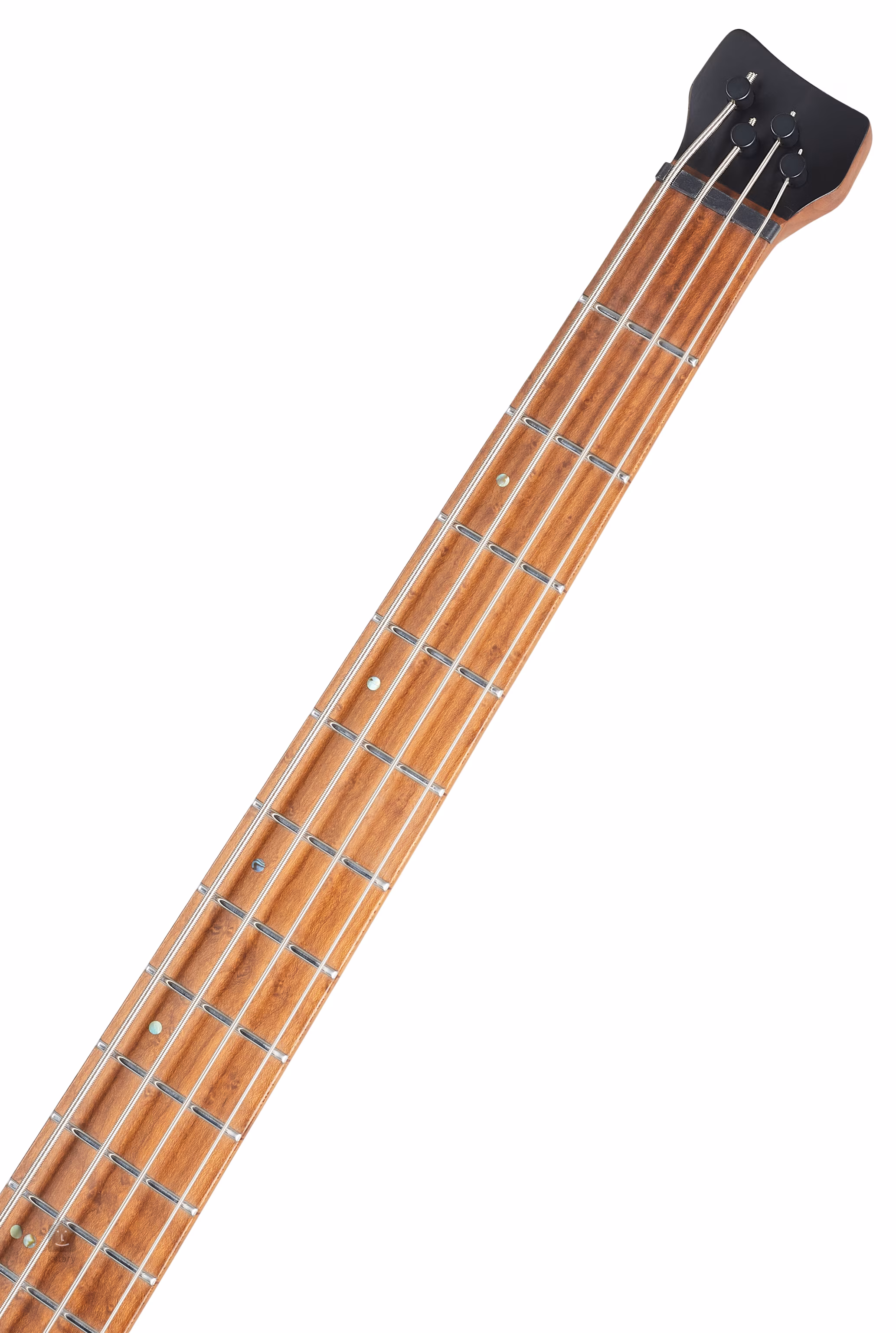 Le corps de l'instrument est en tilleul américain, ce qui est léger en soi, mais grâce au chambrage, il éleve la basse dans la catégorie des ultralégers, tout en conservant un excellent équilibre et, grâce aux bords arrondis, une excellente ergonomie. Le manche est fixé au corps par cinq vis et est fabriqué a partir d'une combinaison de noyer et d'érable dans la populaire finition "grillée", renforcée par des barrages en graphite. La touche est en érable grainé, également en finition grillée. Une autre caractéristique intéressante de cet instrument est le raccourcissement des menus.