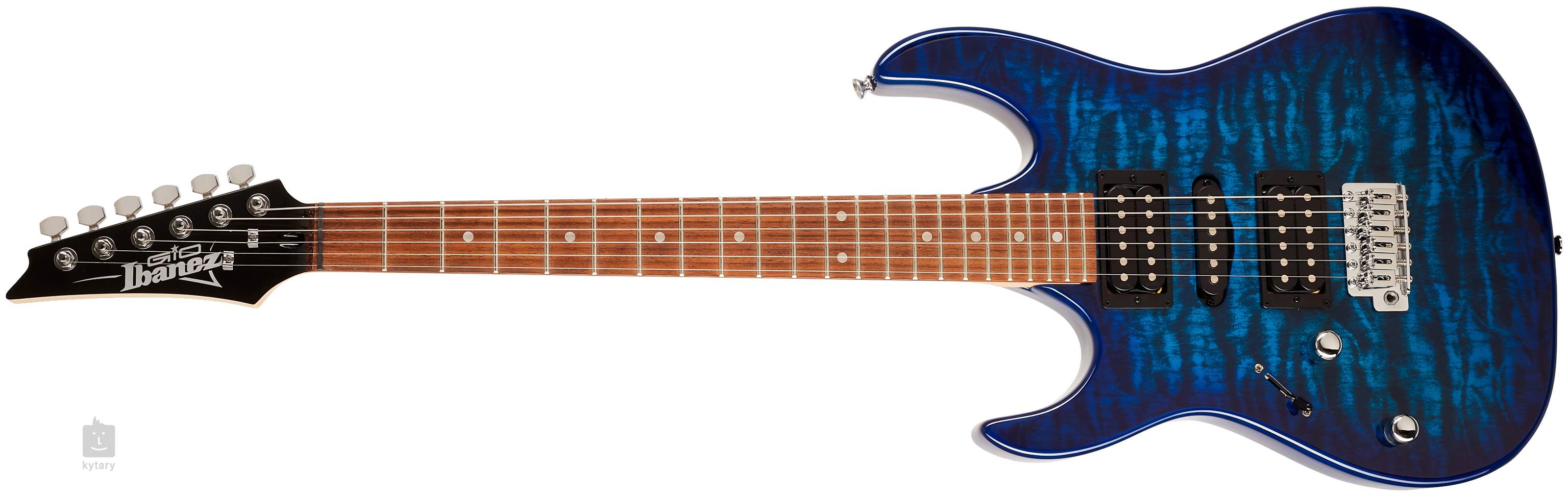 Le corps en peuplier du modele pour gaucher GRX70QAL-TBB est décoré d'une finition Transparent Blue Burst accentuée par un motif en érable nuageux (il ne s'agit pas d'un véritable placage en érable). Le manche en érable est collé a une touche en jatoba avec vingt-deux frettes de taille moyenne. L'orientation sur sa surface est traditionnellement facilitée par des points de position blancs.