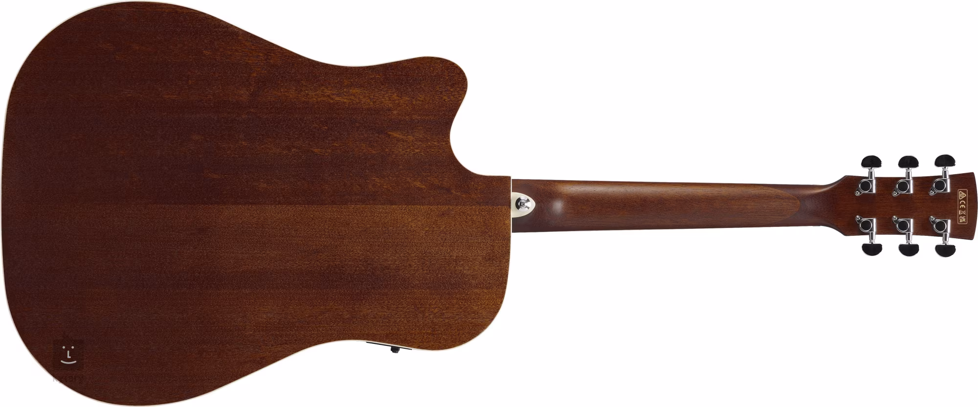 La PF16MWCE-OPN est une guitare électro-acoustique dotée d'un corps dreadnought à large résonance. Le corps de la guitare est en okoumé laminé. Le manche est en bois de nyatoh et la touche est en bois de figuier avec 20 frettes. La touche plus large plaira aux joueurs ayant des doigts plus longs ou aux musiciens habitués à jouer de la guitare classique, tandis que l'adaptation aux positions plus élevées est facilitée par le pan coupé du bas du corps.