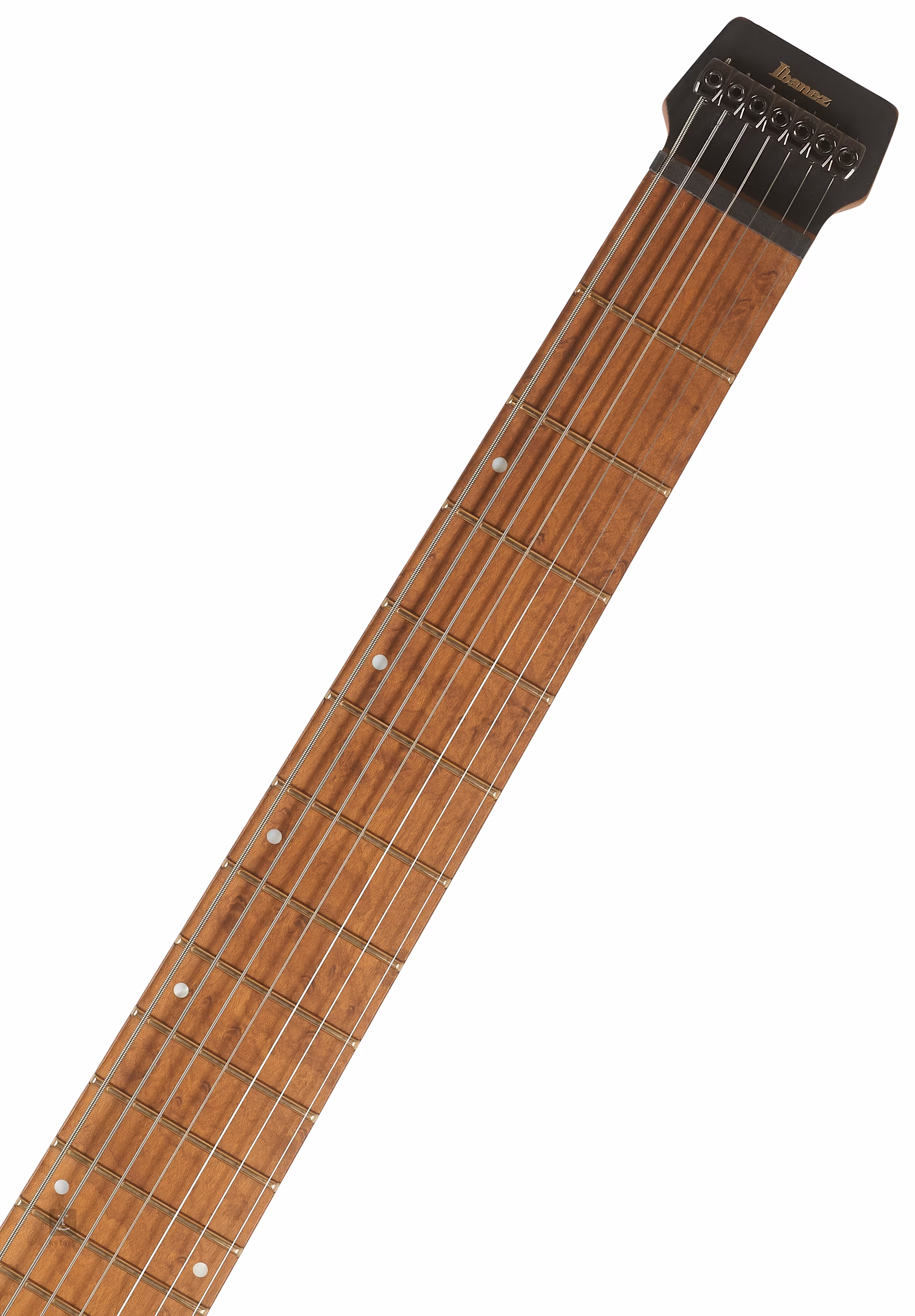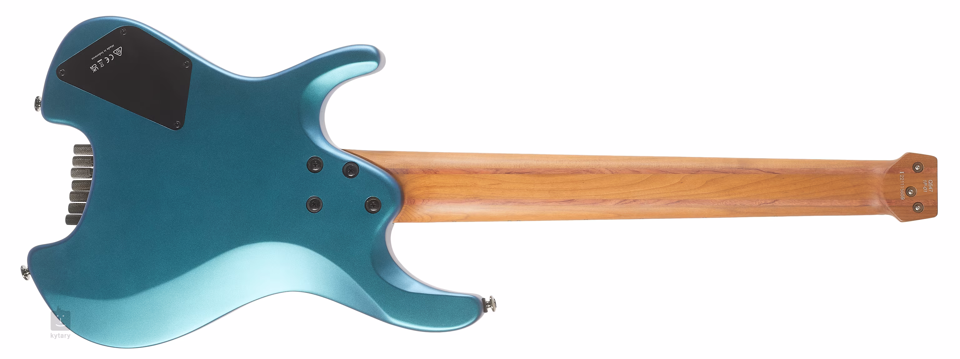 Le corps du modèle à sept cordes Q547-BMM est en bois de nyatoh. Un manche en cinq parties en érable traité thermiquement (ou, si vous préférez, cuit) et en bubinga exotique est collé à une touche en érable greffé (également traité thermiquement) équipée de vingt-quatre frettes Jescar EVO Gold. L'orientation sur la surface de la touche est facilitée par des points luminescents perlés en position et sur les côtés.