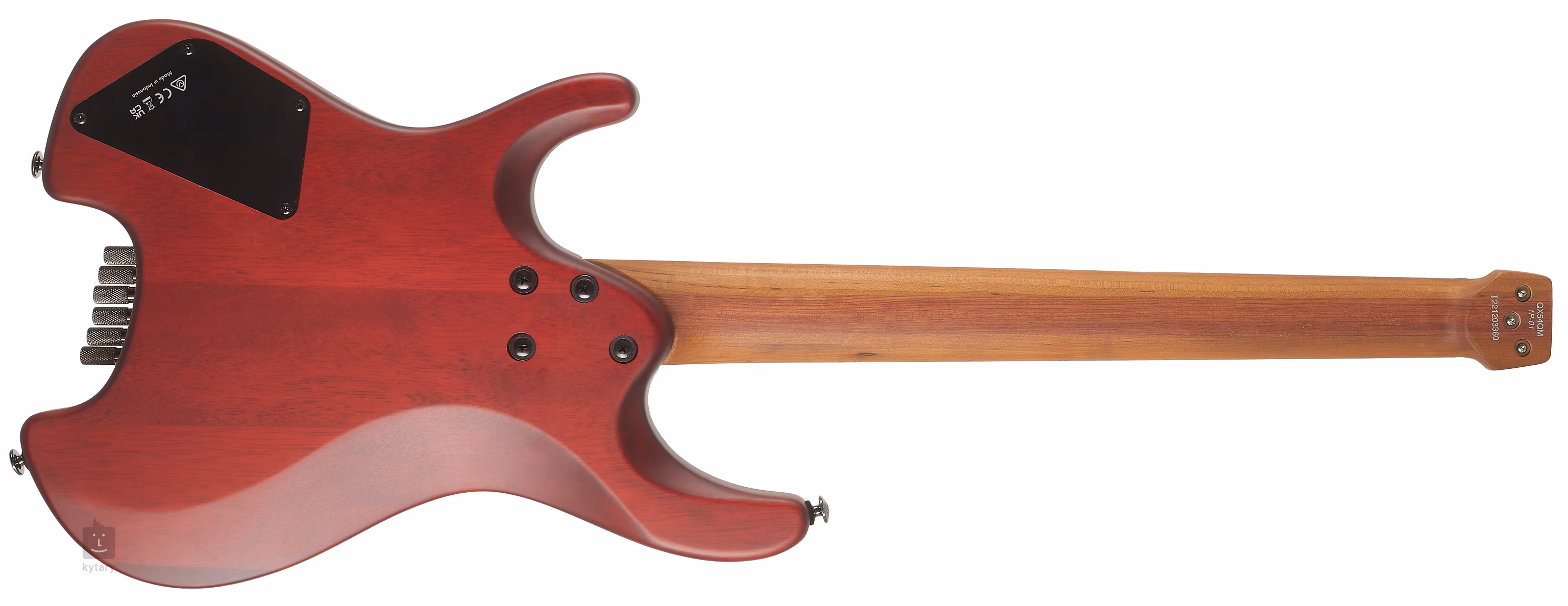 Le corps du QX54QM est fait de bois de nyatoh et d'un placage supérieur d'érable soufflé. Collée sur le manche en trois parties en érable traité thermiquement (ou si vous préférez, cuit) et en bubinga exotique, se trouve une touche en érable greffé (également traité thermiquement) équipée de vingt-quatre frettes Jescar EVO Gold. Les angles de frettes de 8 degrés répondent aux besoins du joueur moderne, le manche correspondant étant parfaitement adapté à l'inclinaison de la main lors de la pratique de la technique des doigts, du tapping ou du slapping. L'orientation sur la surface de la touche est facilitée par la position des perles et les points luminescents latéraux.