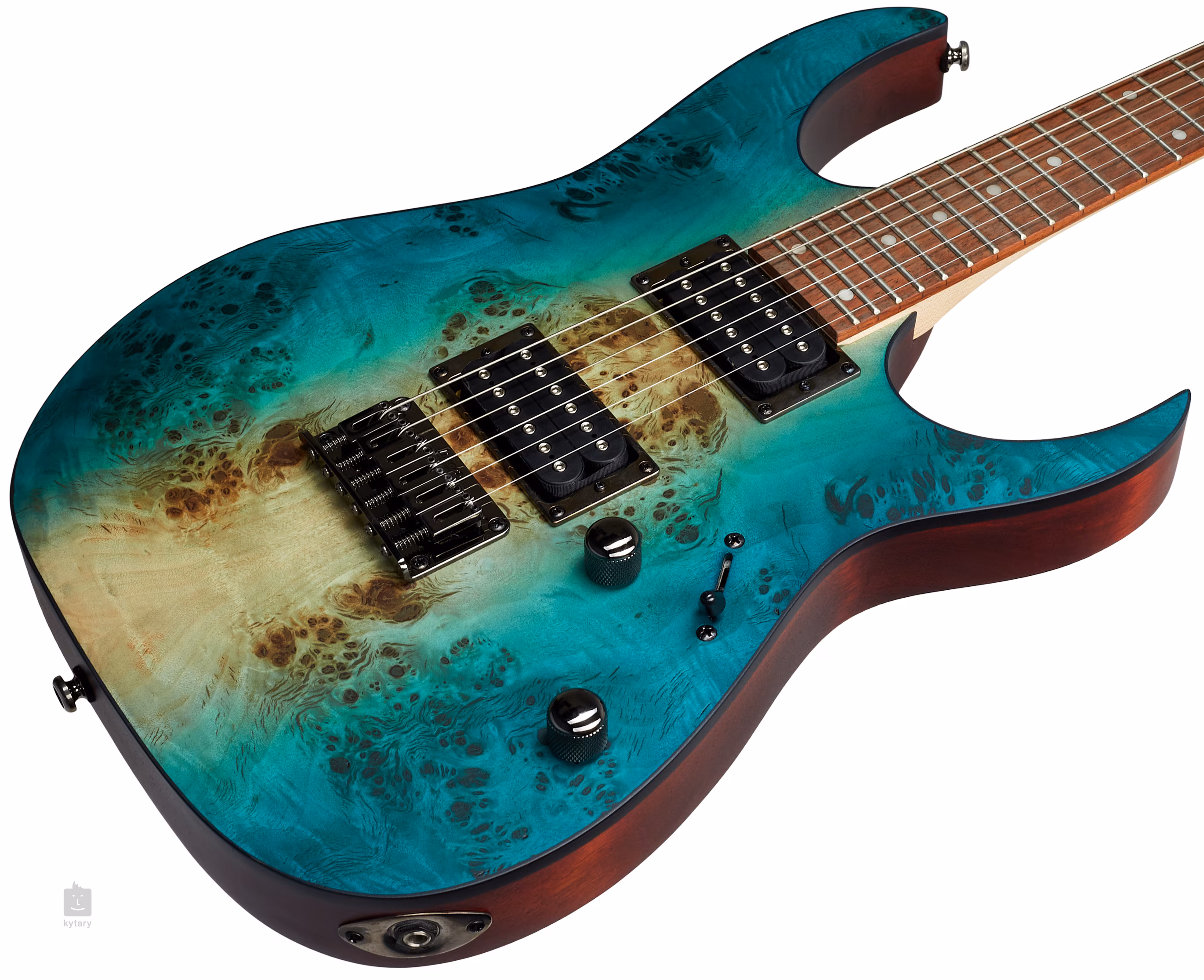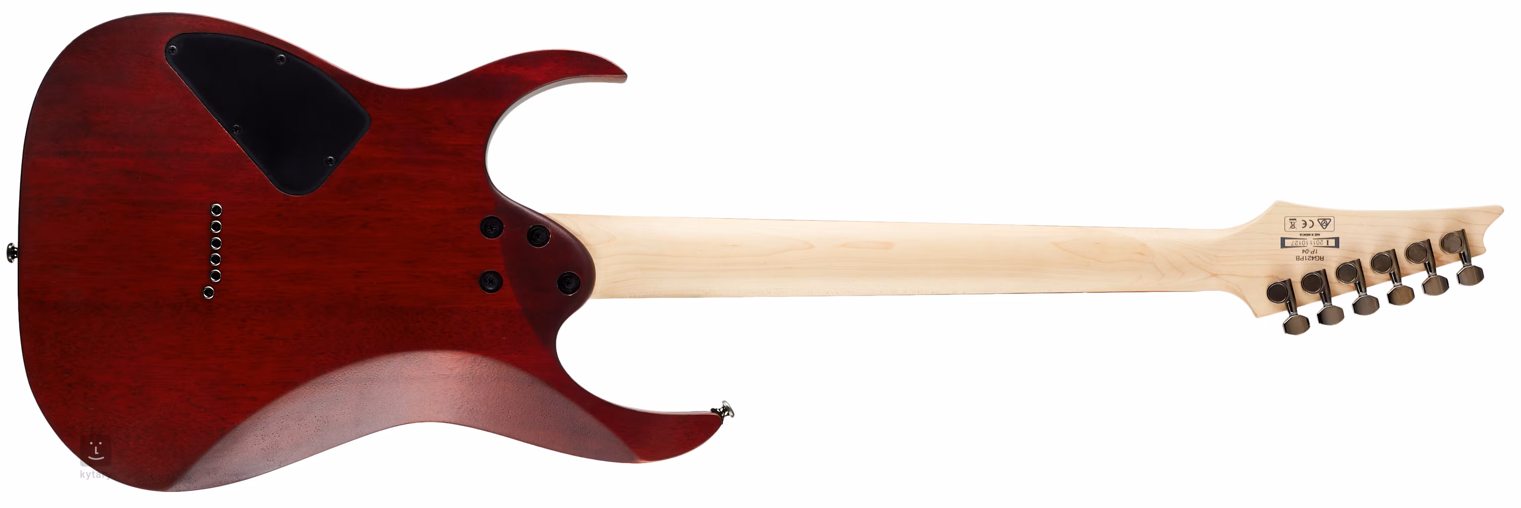 Le corps en méranti de la RG421PB-CHF est orné d'un spectaculaire placage de ronce de peuplier. Le manche en érable rapide avec profil Wizard III est collé a une touche en jatoba, également appelé cerisier brésilien, avec vingt-quatre frettes jumbo. Les points de position décalés blancs permettent de naviguer facilement sur la surface de la touche.