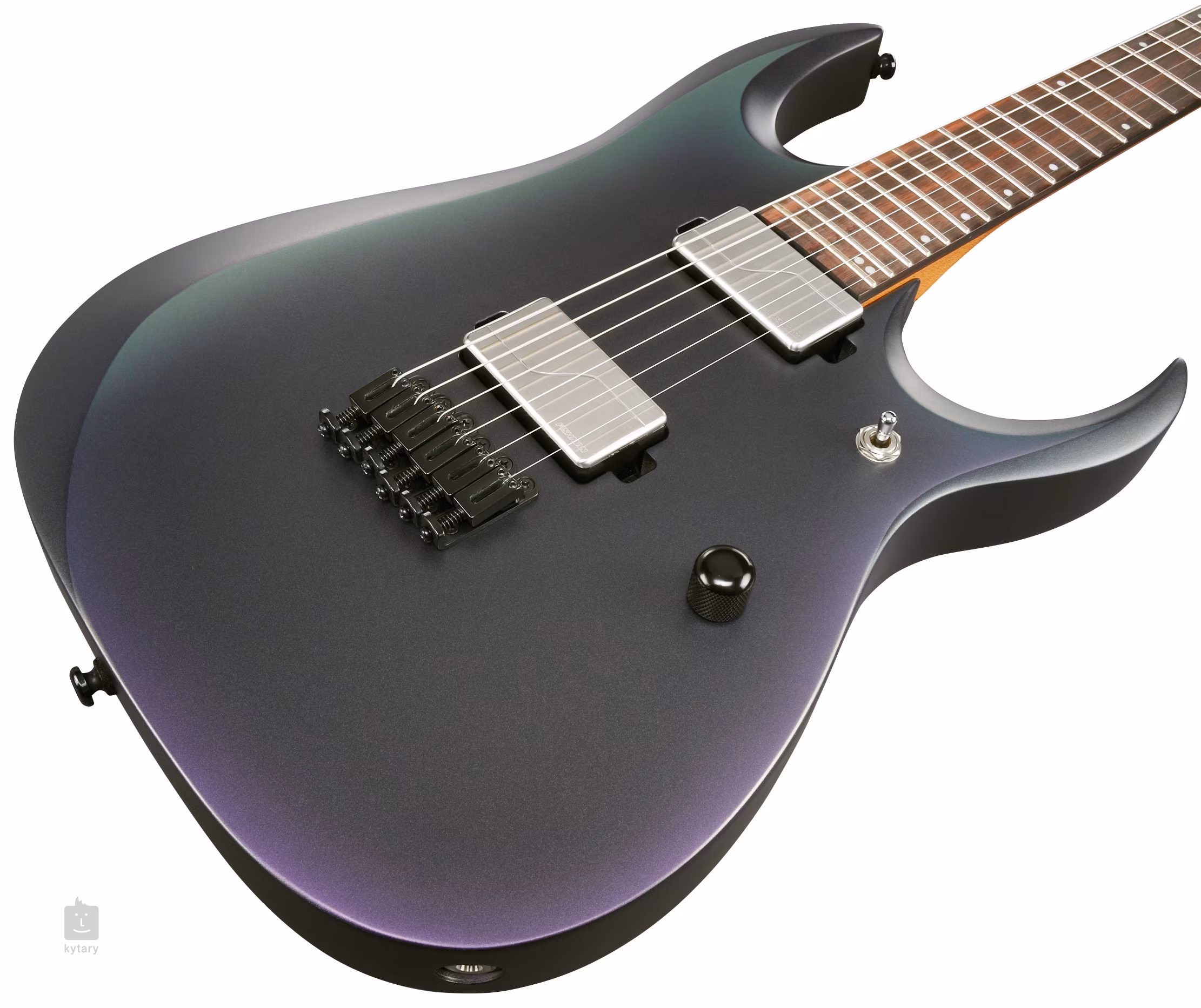 Le corps en bois de nyatoh de la RGD61-BAM est fini en Black Aurora Burst Matt. Un manche en érable grillé est fixé à une touche en érable grillé, en ébène de macassar, dotée de 24 frettes jumbo. Grâce à la jauge plus longue (673 mm), la guitare peut facilement supporter les accordages standard lower et drop. L'orientation sur la touche est facilitée par des points de positionnement décalés et des points luminescents sur le côté.