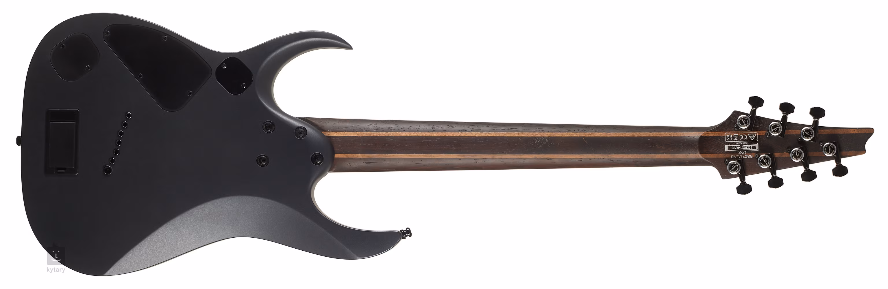Le corps de la RGD71ALMS a sept cordes est fabriqué en bois exotique de nyato. Le manche, composé de cinq pieces de noyer et de panga panga, est collé a une touche en ébene Makasar équipée de vingt-quatre frettes jumbo traitées par cryogénie. Le concept Multi-scale, actuellement en vogue, qui consiste a équiper la touche de frettes placées en diagonale, confere a l'instrument une menzaura variable (648 mm - 686 mm) et une tension optimale. De l'avis de certains musiciens, il permet également un mouvement plus naturel de la main sur la touche. L'orientation sur la surface de la touche est facilitée par des points de position décalés blancs et des reperes luminescents sur le côté.